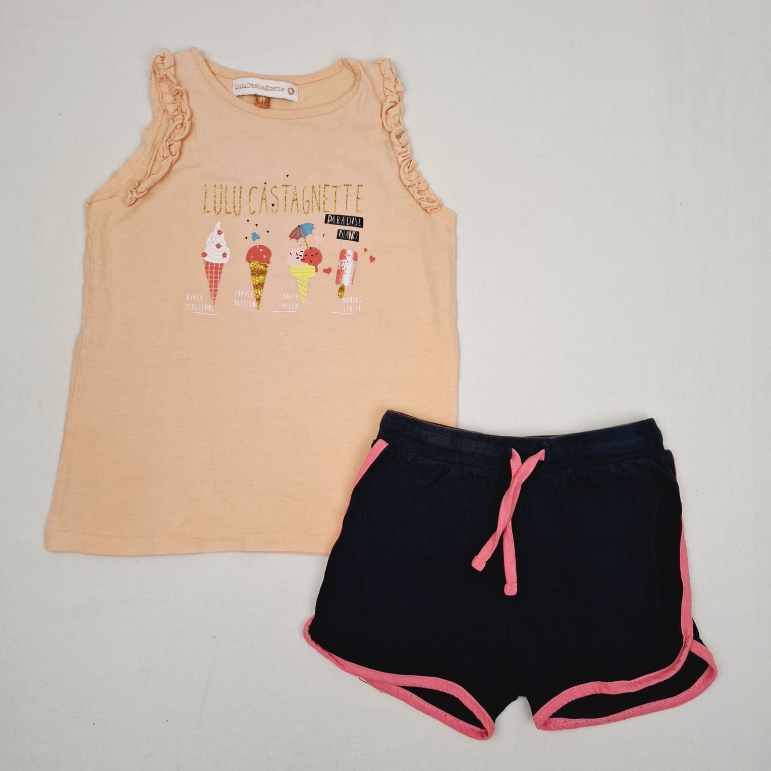 Autres commentaires : Ensemble 2 pièces : – Un short de sport noir U, taille élastique, – Un débardeur fuchsia LuluCastagnette, avec des motifs de glaces