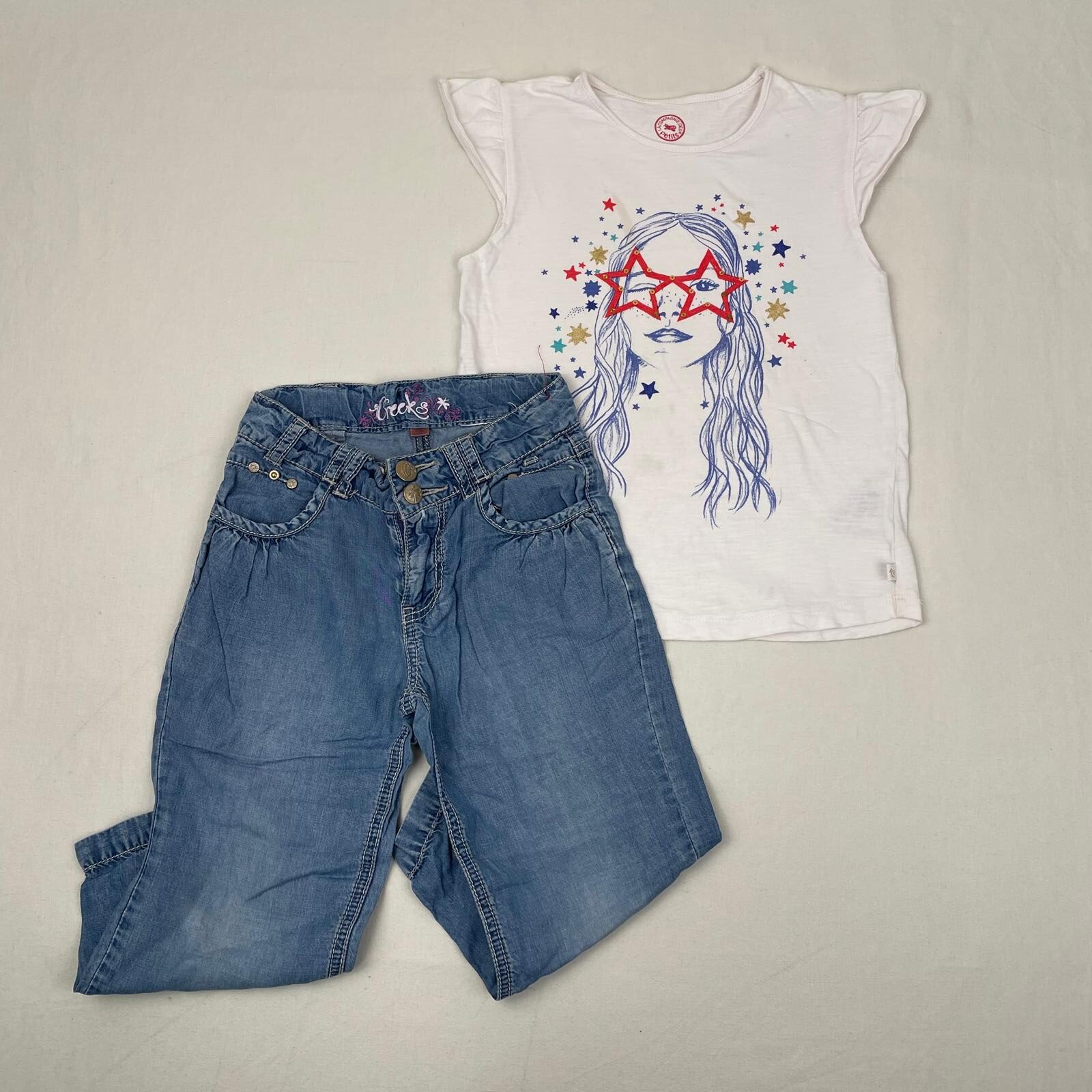 Autres commentaires : Ensemble 2 pièces: – T-shirt La Compagnie des Petits blanc sans manches, motif fille, col rond, volants sur les épaules, 100% coton. – Pantacourt Creeks en denim, fermeture par boutons et zip, ceinture ajustable par élastique intérieur.