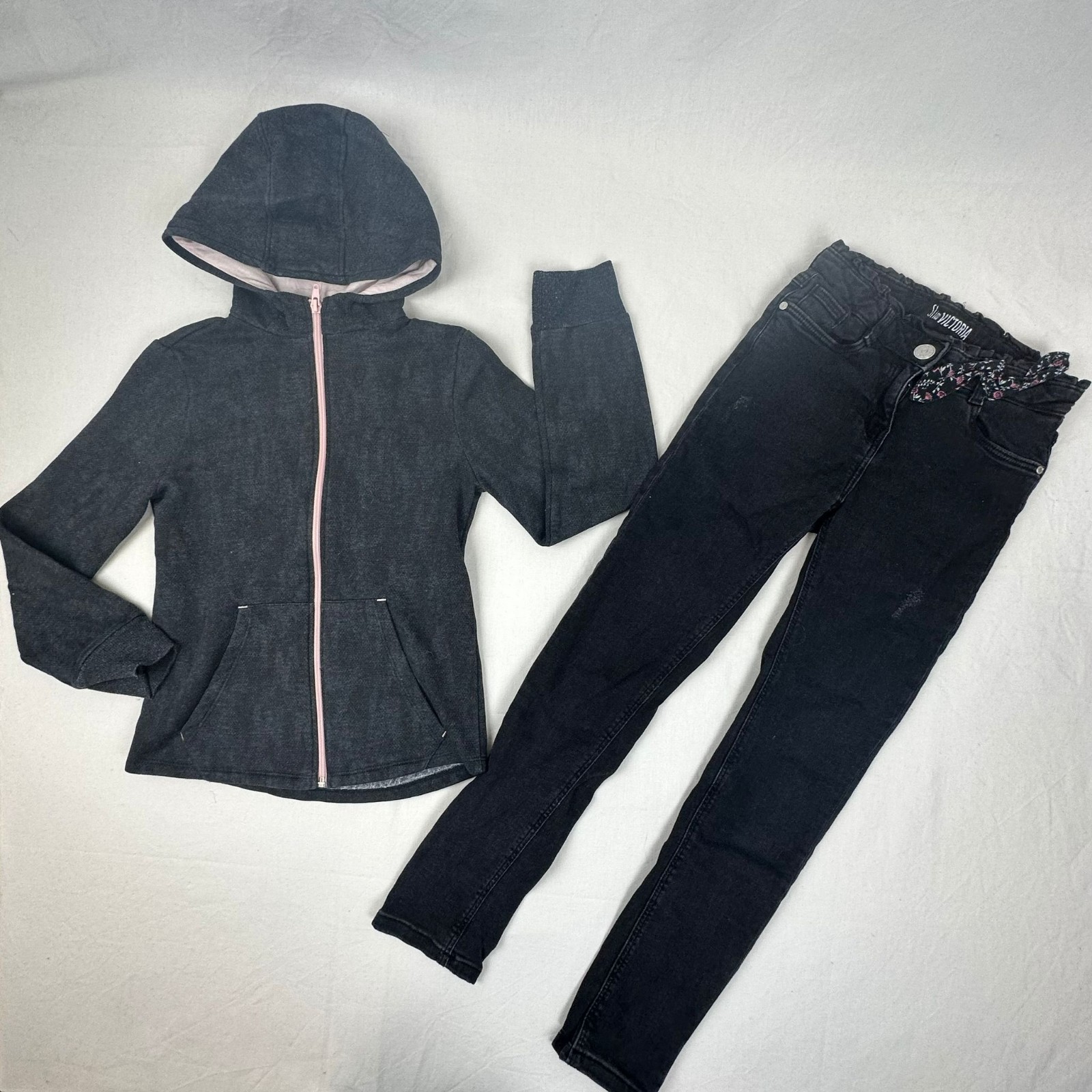 Autres commentaires : Gilet Decathlon manches longues gris avec une fermeture en zip et une capuche. Jean noir Slim Tape à l’oeil avec taille élastiquée et ceinturée.