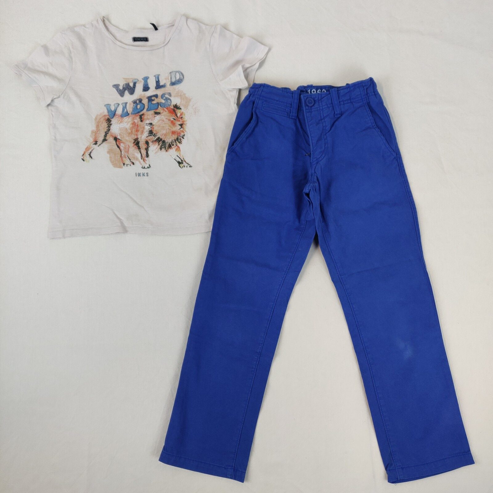 Autres commentaires : Un t-shirt à manches courtes IKKS – beige avec motif central lion accompagné de l’inscription « Wild vibes ». Plusieurs tâches marrons. Un pantalon Gap – bleu. Taille ajustable. 2 poches latérales et 2 poches arrières. Passants pour une ceinture. 2 petites tâches blanches dans le haut et marque d’usure au niveau du bas de la jambe gauche. Niveau réduit de kiwi à myrtille.