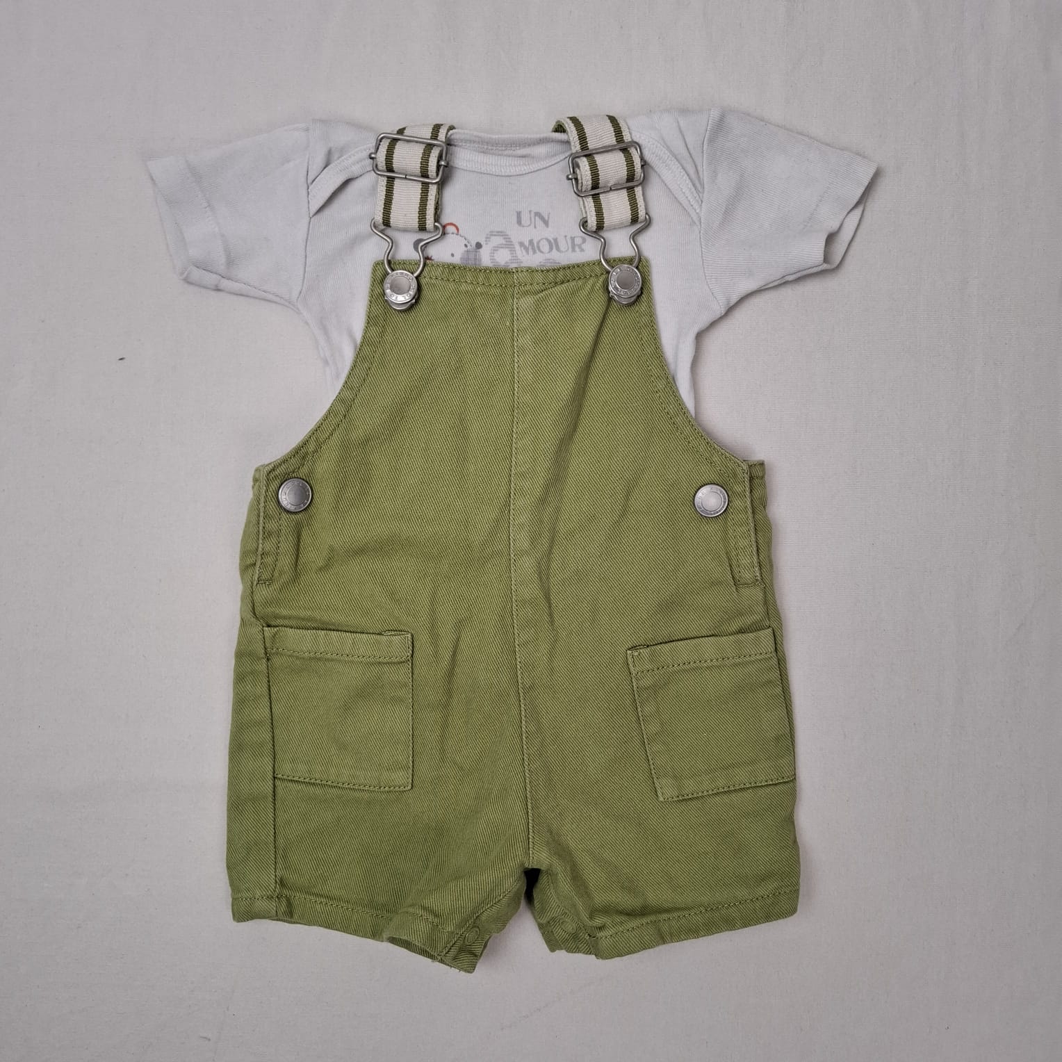 Autres commentaires : Ensemble 2 pièces : – Salopette jean verte PRIMARK, bretelles à boucles réglables, fermetures latérales et à l’entrejambe par boutons pression. – Body manches courtes blanc POMMETTE, motif ourson, inscription « UN AMOUR D’OURS ».