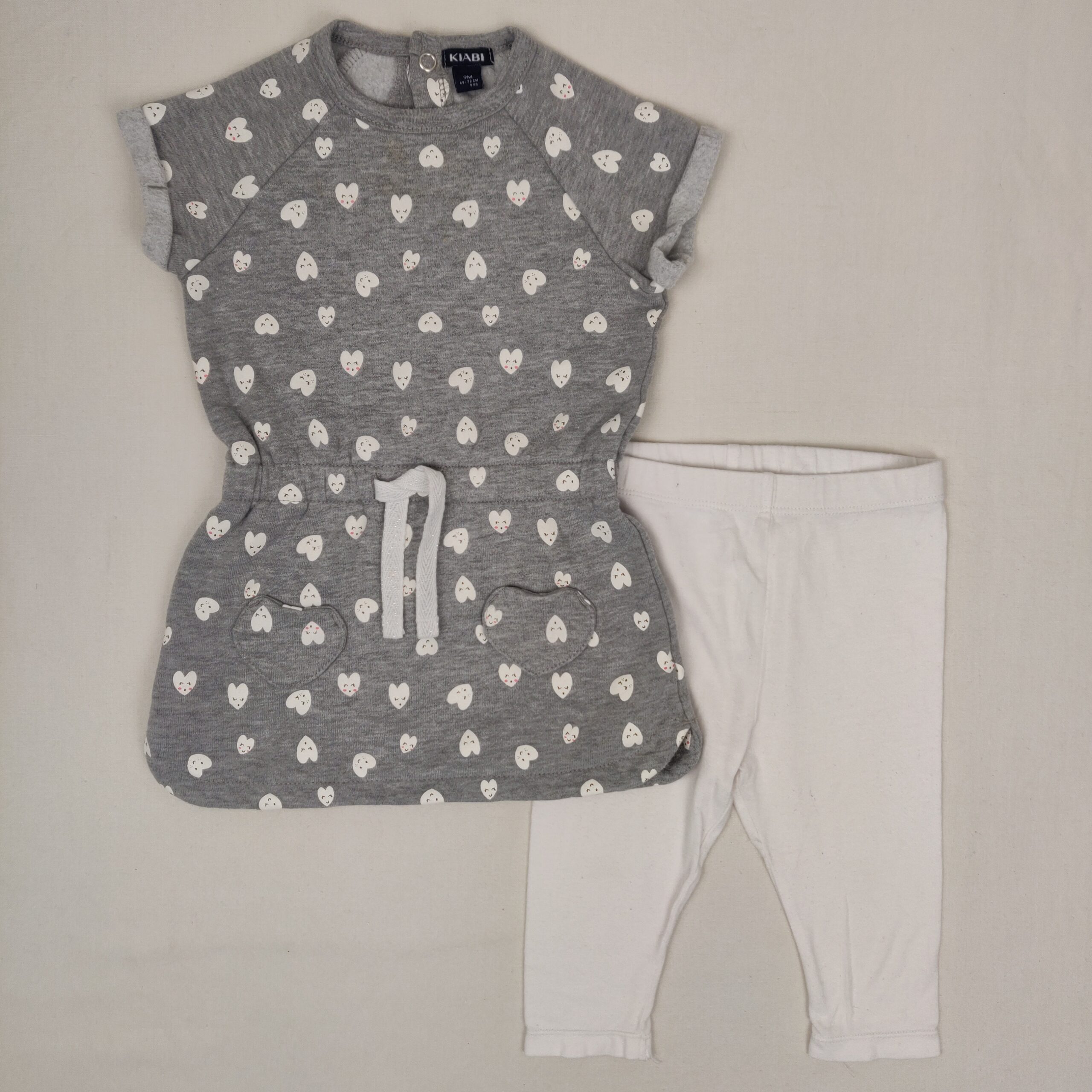 Autres commentaires : Ensemble 2 pièces : – Robe tunique Kiabi grise parsemée de mini visages en forme de coeurs blancs, taille élastiquée avec lanières de serrage, fermeture au dos par boutons pression, 61% coton et 39% polyester. – Leggings Brioche blancs, taille élastiquée, 95% coton et 5% élasthanne.