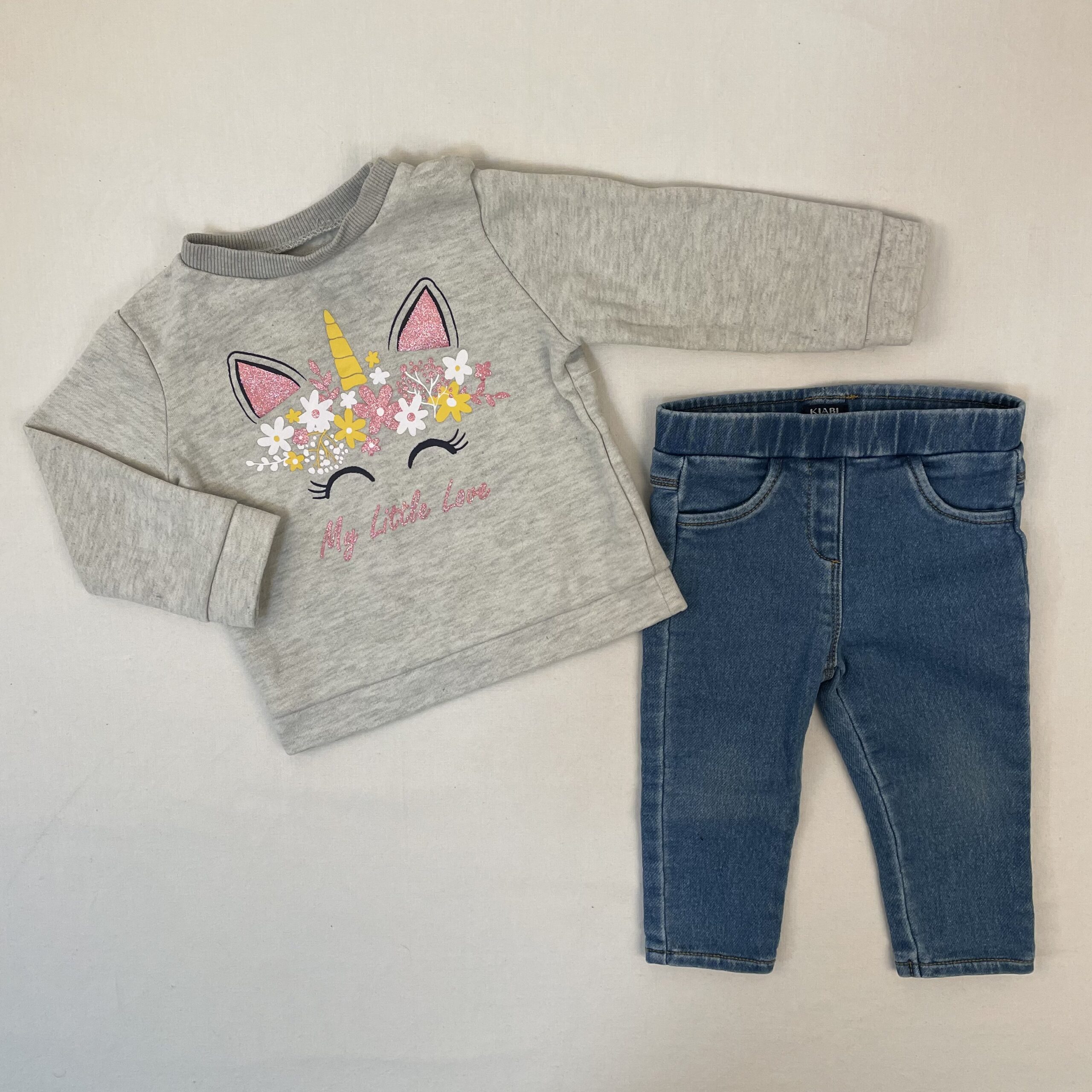• Sweat de couleur grège, devant motif licorne et fleurs roses, blanches et jaunes.