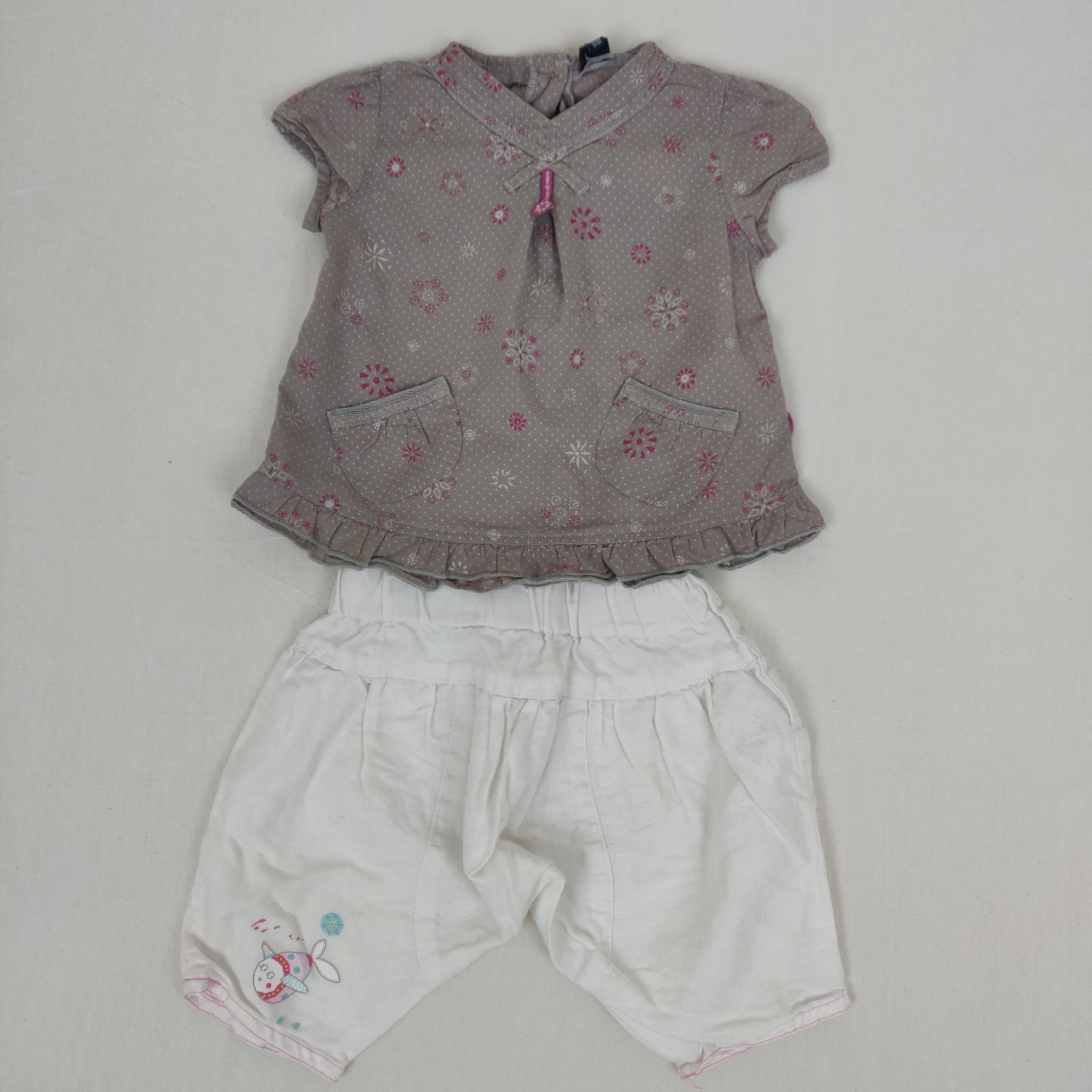 Autres commentaires : 55% laine. Pantalon orchestra large blanc avec taille élastiquée. 100% coton: T-shirt manches courtes marron Terre de marins avec motif fleuri et col V.