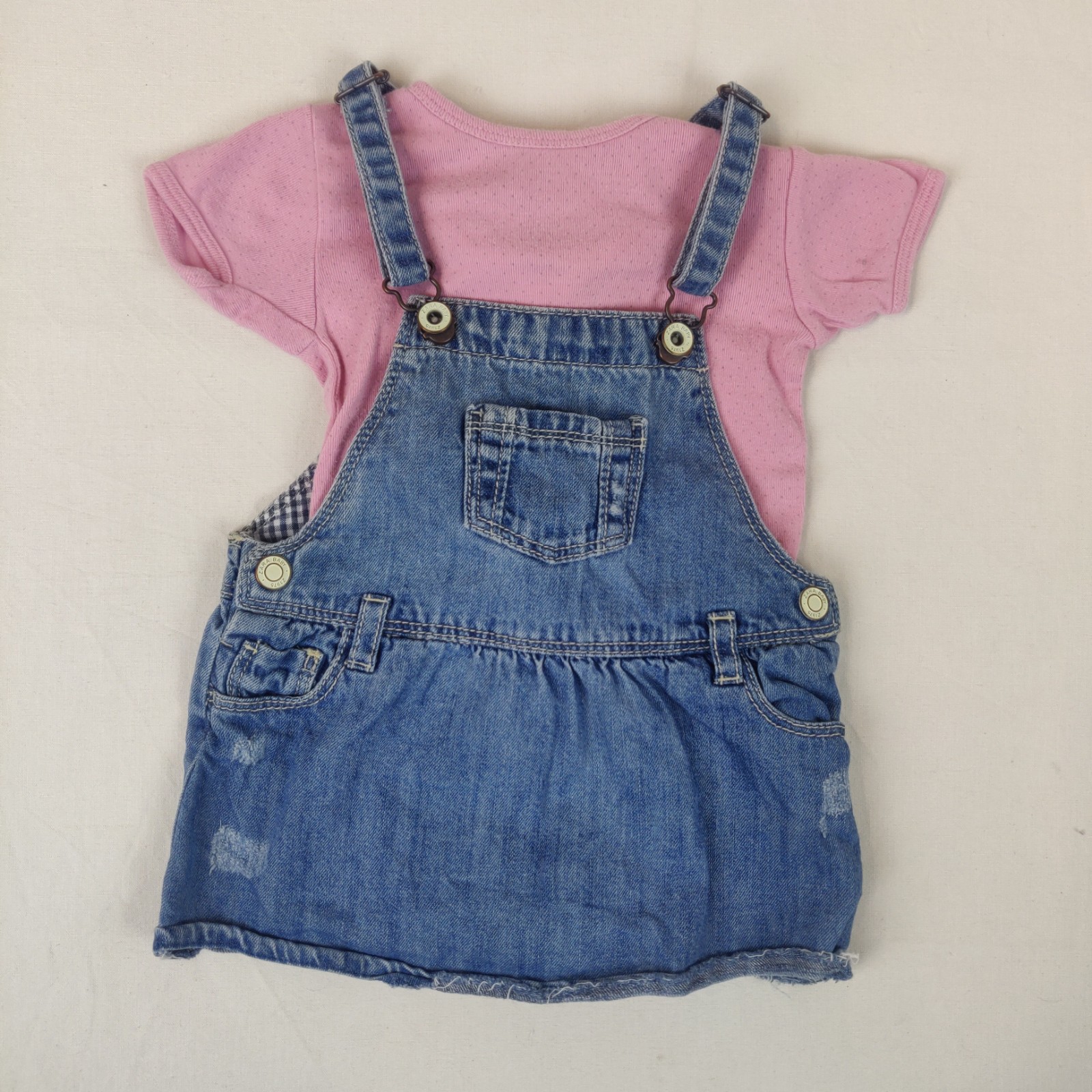 Autres commentaires : Esemble 2 piéces, une robe salopette bleu de zara avec des petites poches devant et derriére et des petites boutons . un body rose de Bout’s chou et contient 100% de coton , des fermetures à boutons pressions sur le dos et en bas du body .