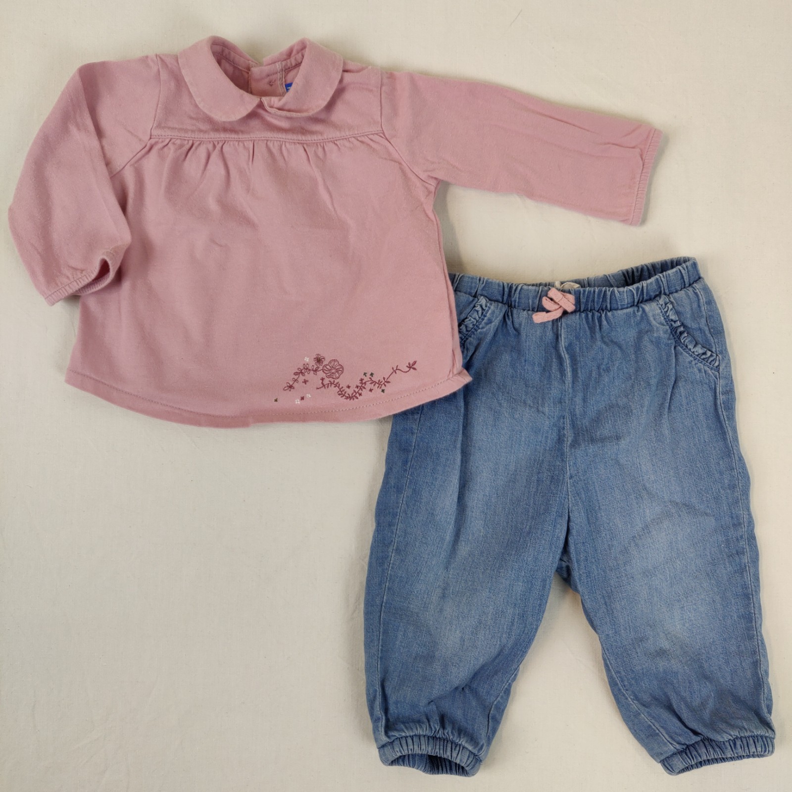 Autres commentaires : Ensemble 2 pièces. Un t-shirt Bout’chou à manches longues – rose. Col claudine. Motifs floraux brodés près de la taille. Ouverture centrale au dos à boutons. Jean en denim bleu finement doublé. Taille et chevilles élastiques. Usure normale des vêtements.