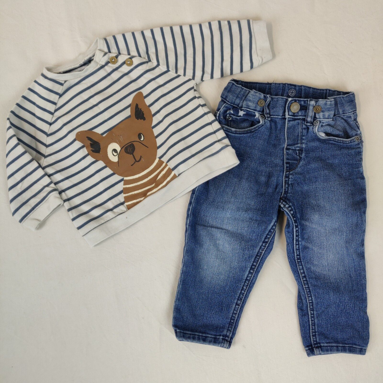 Autres commentaires : Ensemble 2 pièces. Un sweat Vertbaudet – blanc à fines rayures bleues. Motif central chien marron. Ouverture latérale à 2 boutons. Un jean H&M en denim bleu brut. Taille ajustable. 2 poches latérales et 2 poches arrières. Passants pour une ceinture. Marques d’usure au niveau des jambes.