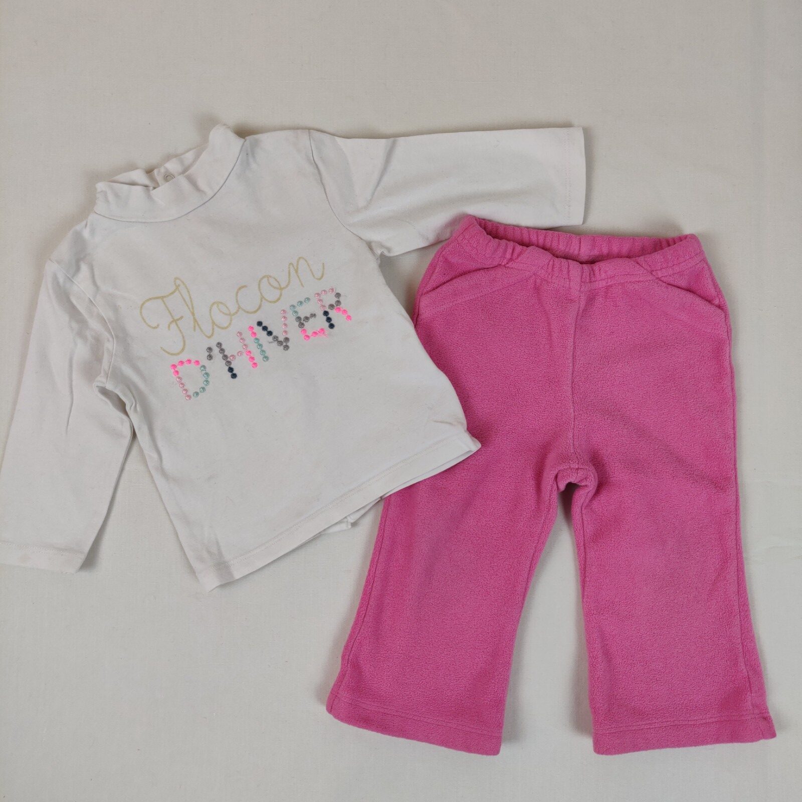 Autres commentaires : 6% élasthanne. Ensemble 2 pièces. T-shirt à manches longues Kiabi – écru avec inscription pailletée dorée et brodée « Flocon d’hiver ». Ouverture centrale au dos à pressions. Léger effet pelucheux. Pantalon Carter’s (taille 12 Mois – 100% polyester) en polaire rose. Taille élastique. 2 poches latérales en trompe-l’oeil.
