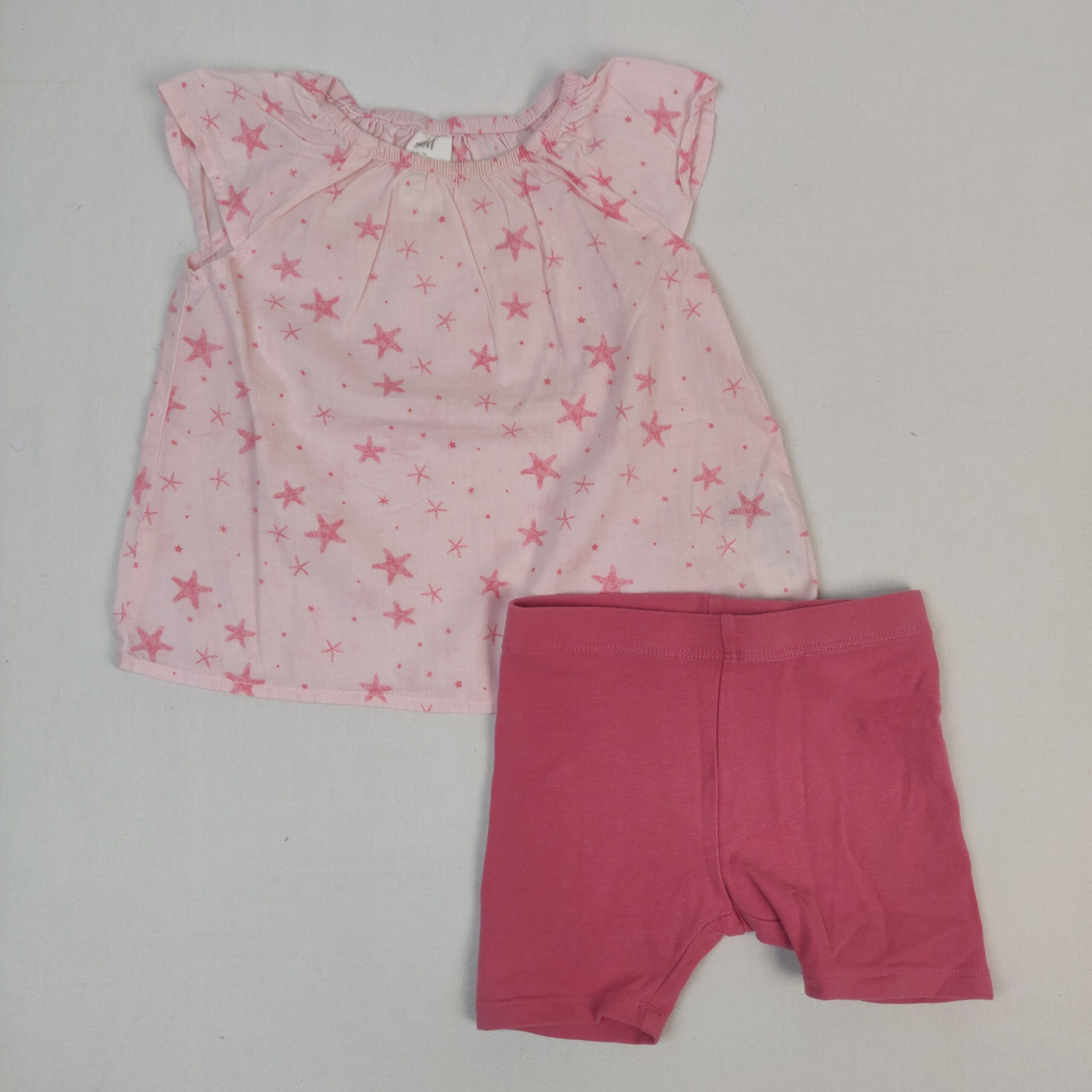 Autres commentaires : Ensemble 2 pièces : – Blouse sans manches H&M rose clair motifs étoiles de mer, col élastique. – Short rose NEXT en jersey 92% coton et 8% élasthanne, taille élastique.