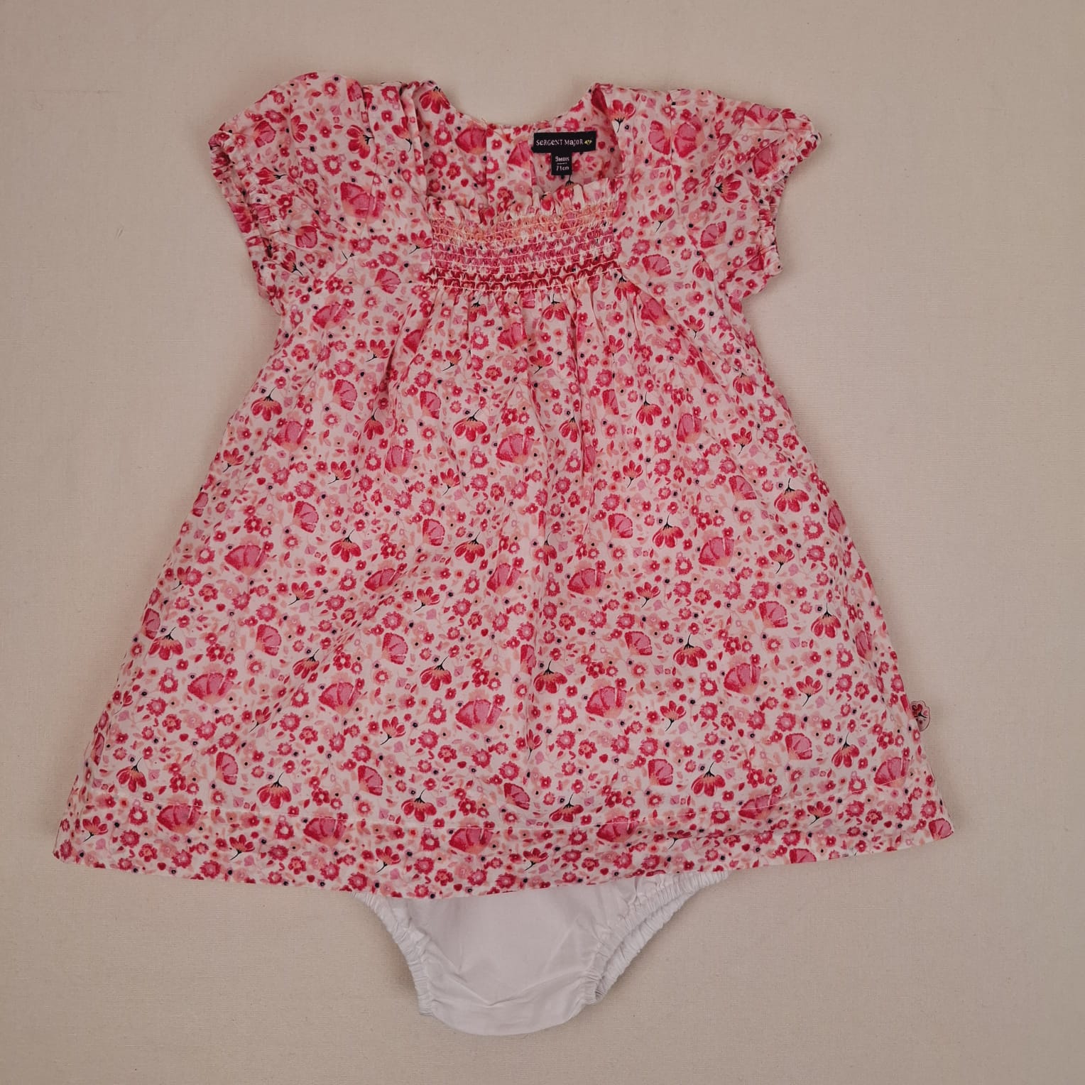 Autres commentaires : Ensemble deux pièces : – Robe; 9 mois, Sergent Major, blanc à motifs floral rose , bouton à l’arrière de la robe pour l’ouvir. -Culotte blanche simple, avvec élastique, du pareil au même