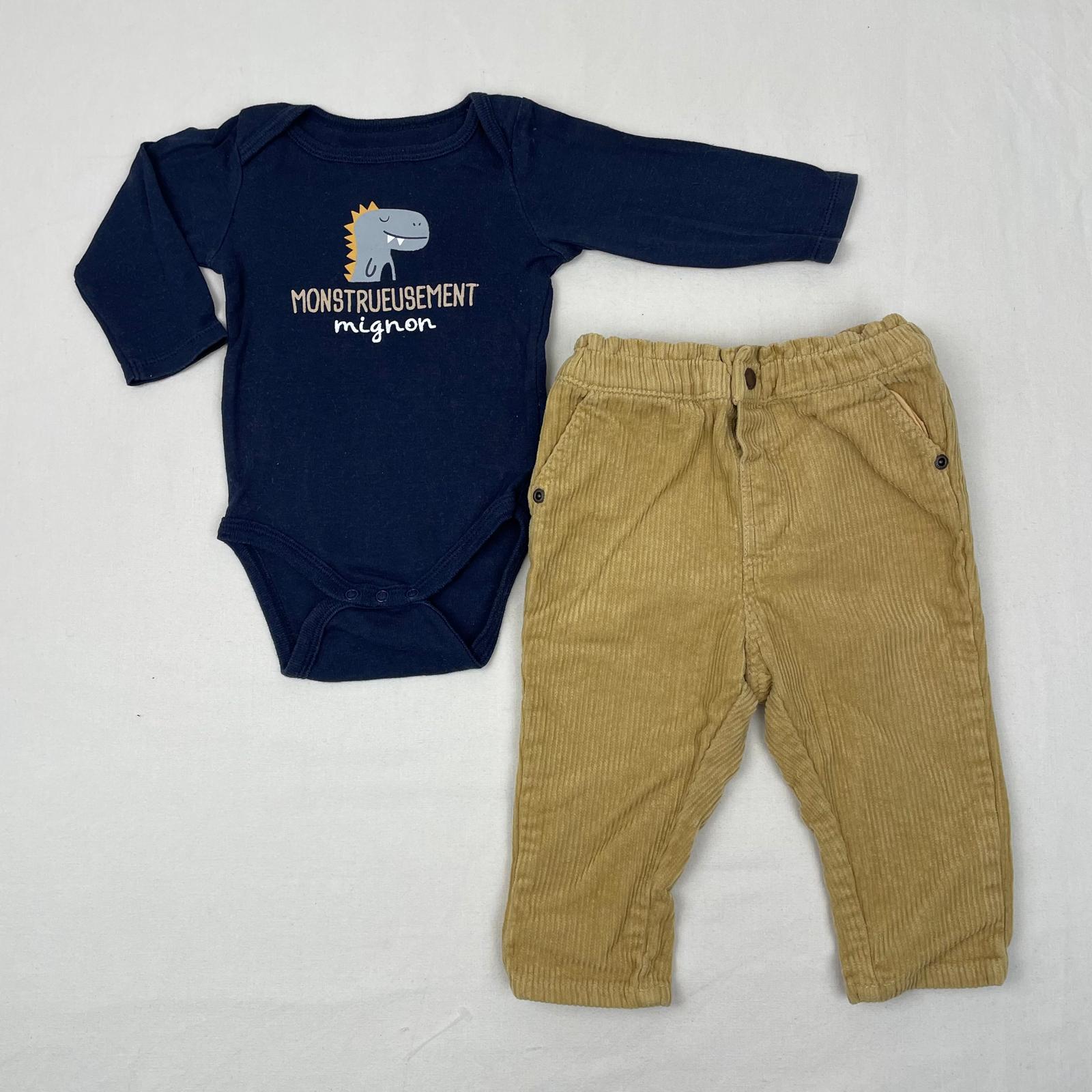 Autres commentaires : Ensemble 2 pièces: -Body Gemo bleu marine à manches longues, col US, motif de dinosaure et inscription « Monstrueusement mignon ». – Pantalon droit en velours côtelé jaune sable, ceinture élastique, fermeture par bouton pression.