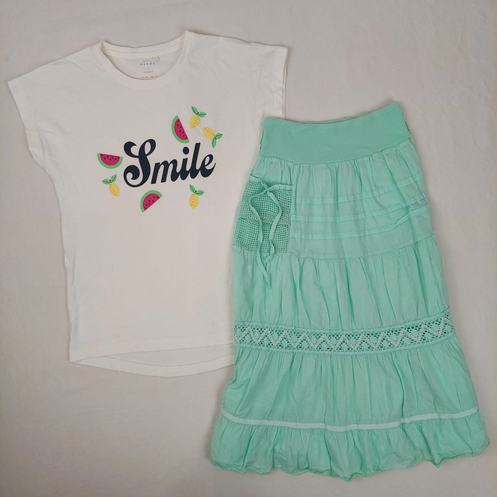 Autres commentaires : 100% coton, T-shirt blanc à manches courtes Name It, imprimé Smile, Jupe vert d’eau neuve sans marque avec broderie anglaise