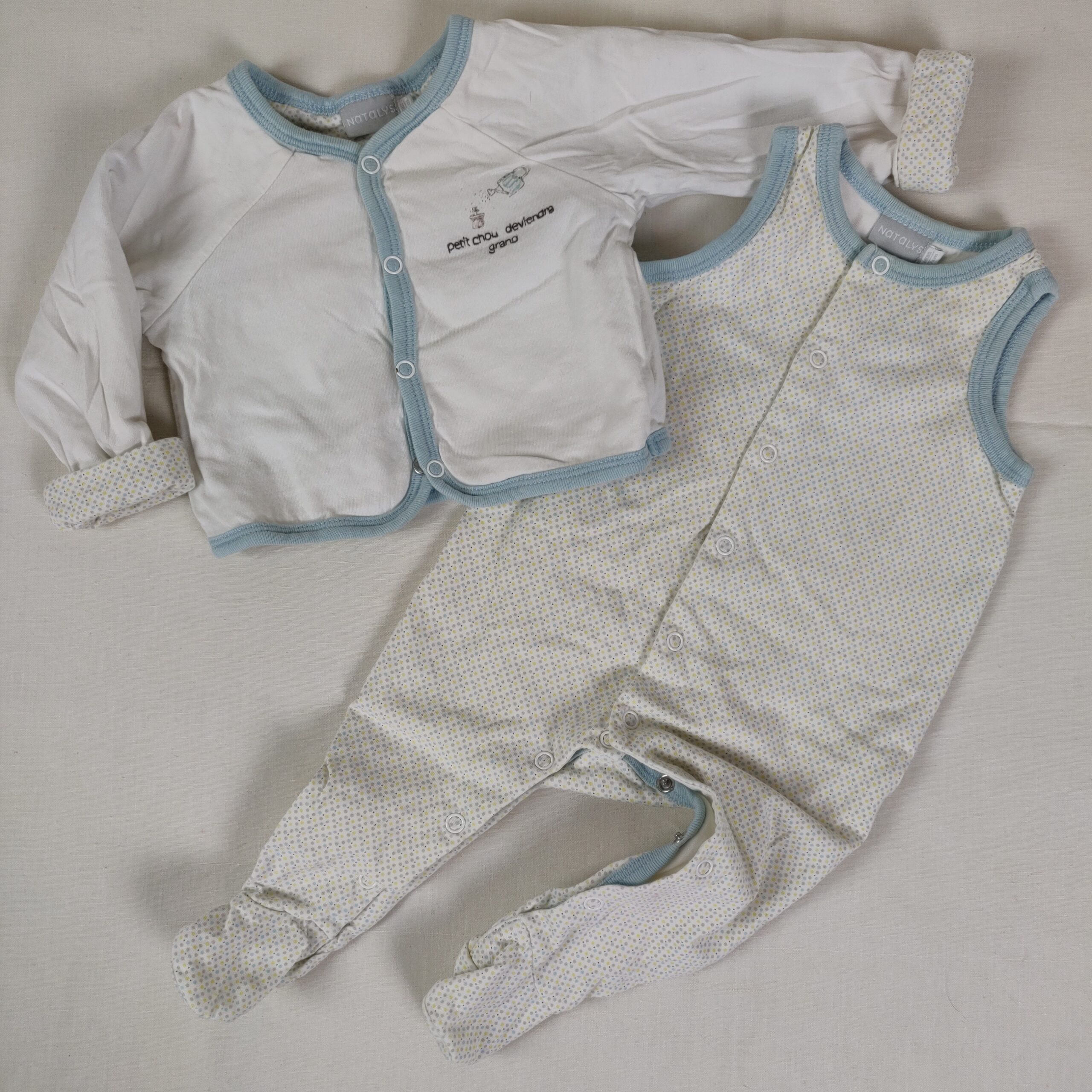 Autres commentaires : Ensemble avec combinaison sans manches avec pieds, blanche avec petits points jaunes gris et bleu pâle, fermeture par boutons pression devant et à l’entrejambe et gilet blanc avec doublure qui rappelle le motif de la combinaison, inscription Petit chou deviendra grand avec mtof plante et arrosoir.