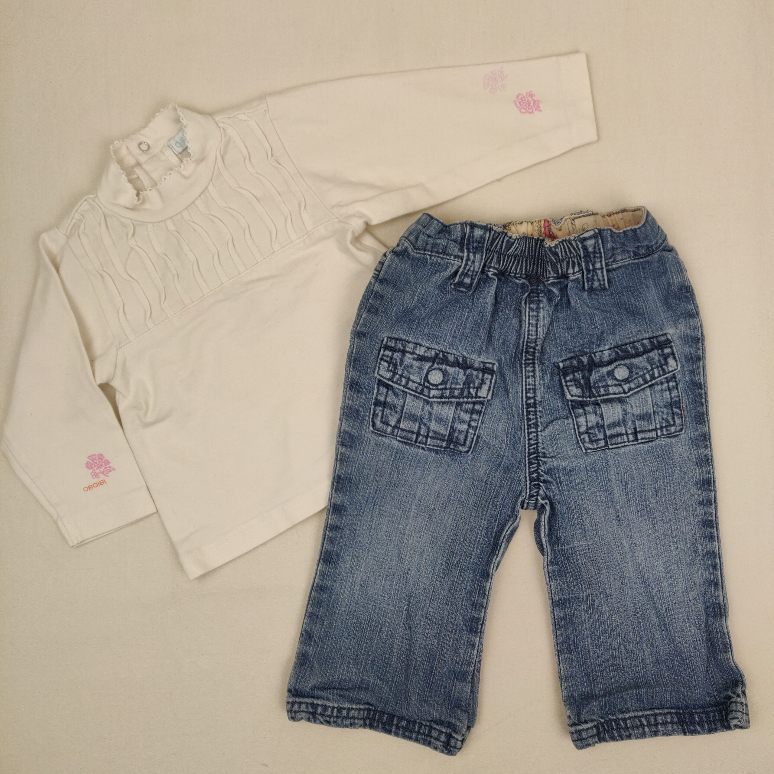 Autres commentaires : Ensemble 2 pièces : – Jeans bleu, taille élastiquée et ajustable par élastique intérieur, 2% élasthanne. – T-shirt blanc manches longues, col cheminée dentelé, fermeture en haut du dos par boutons pression, 5% élasthanne.