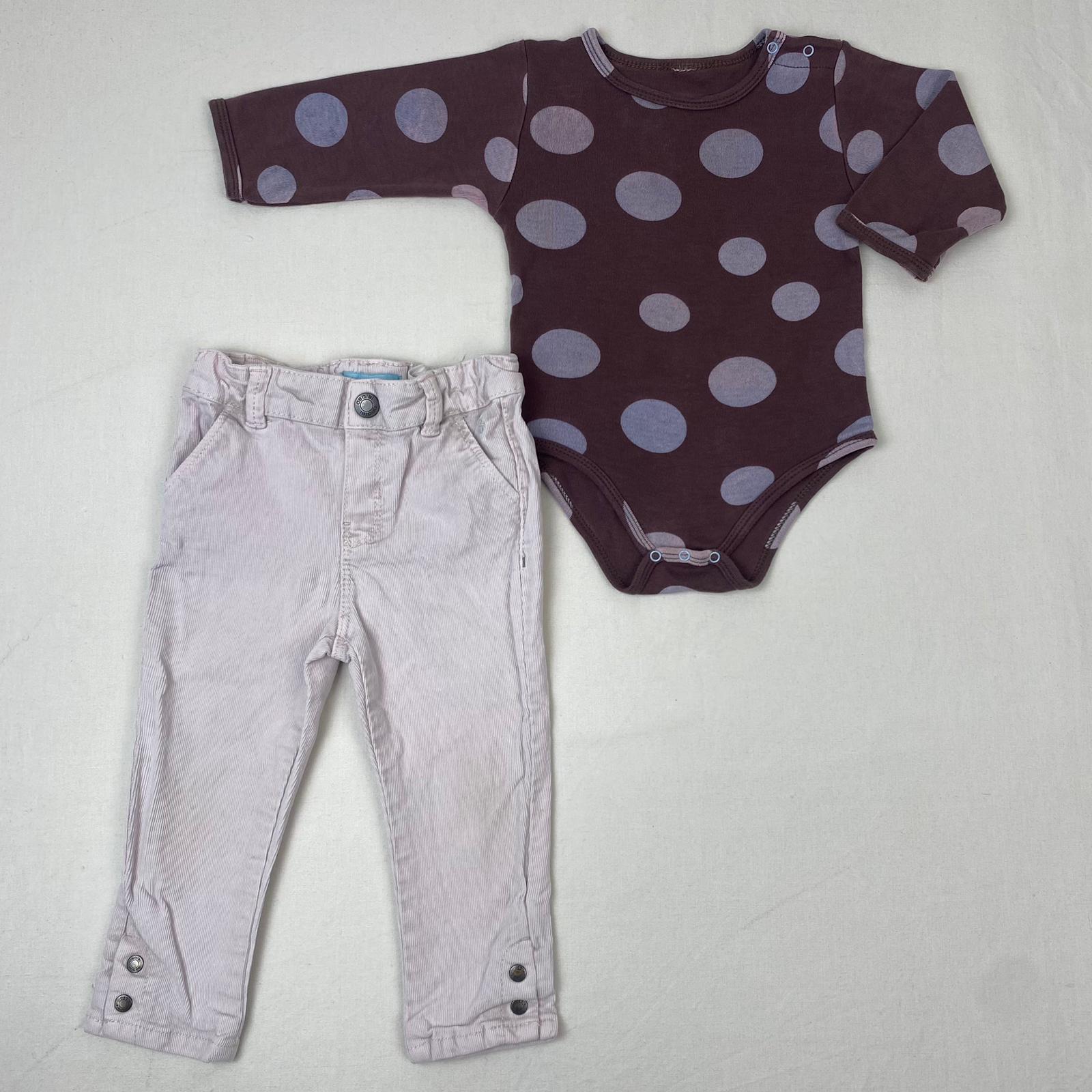 Autres commentaires : Ensemble 2 pièces : – Un body marron à pois mauves, manches longues, fermeture par boutons pressions, -Un pantalon rose en velour cotelé, fermture par boutons pressions, taille élastique