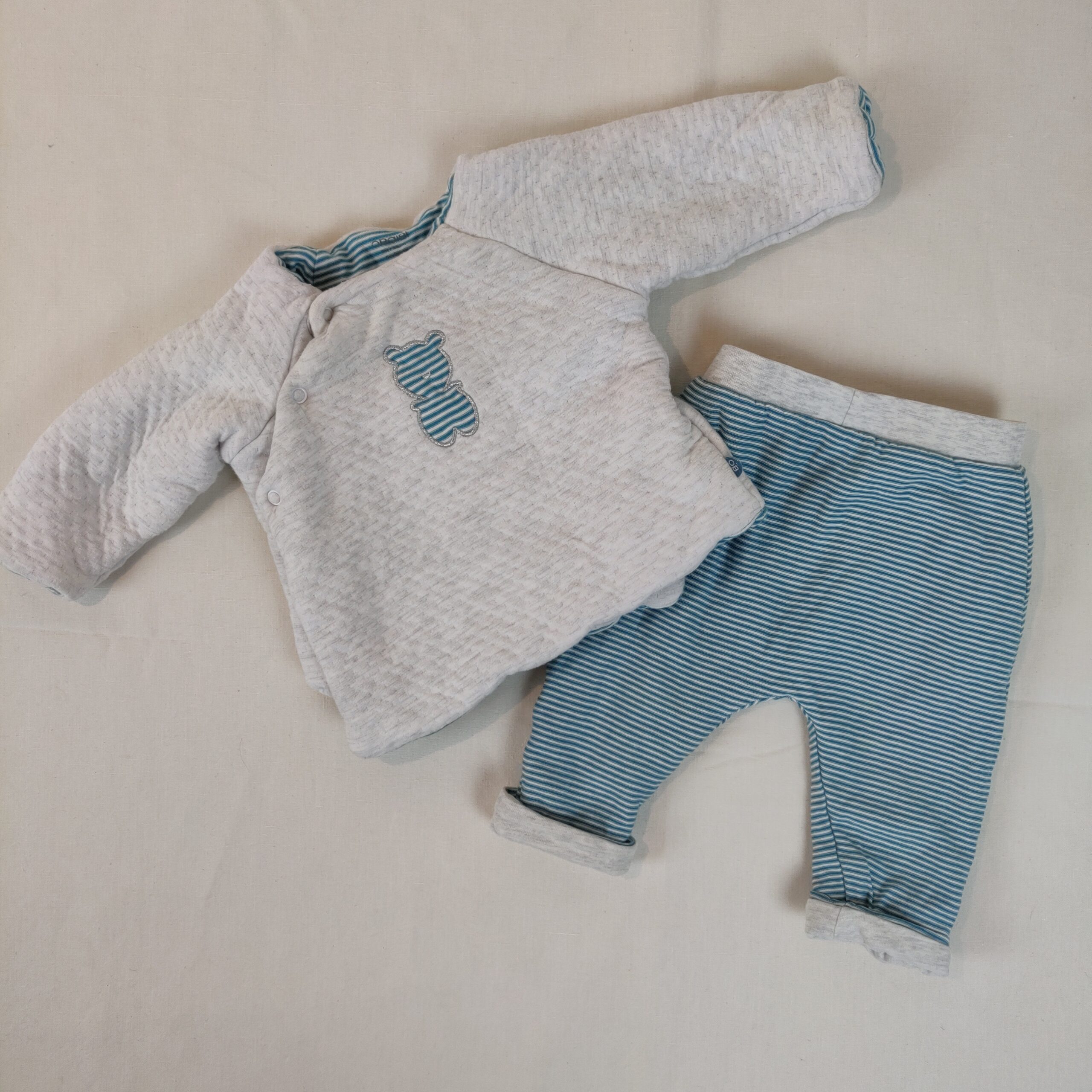 Autres commentaires : 26% polyester. Veste-Gilet – gris chiné à doublure rayée écru et bleu – Ouverture à l’épaule gauche par 3 boutons pression. Ourson central rayé écru et bleu avec un liseré argenté. Pantalon assorti doublé à rayures bleues et écrues.