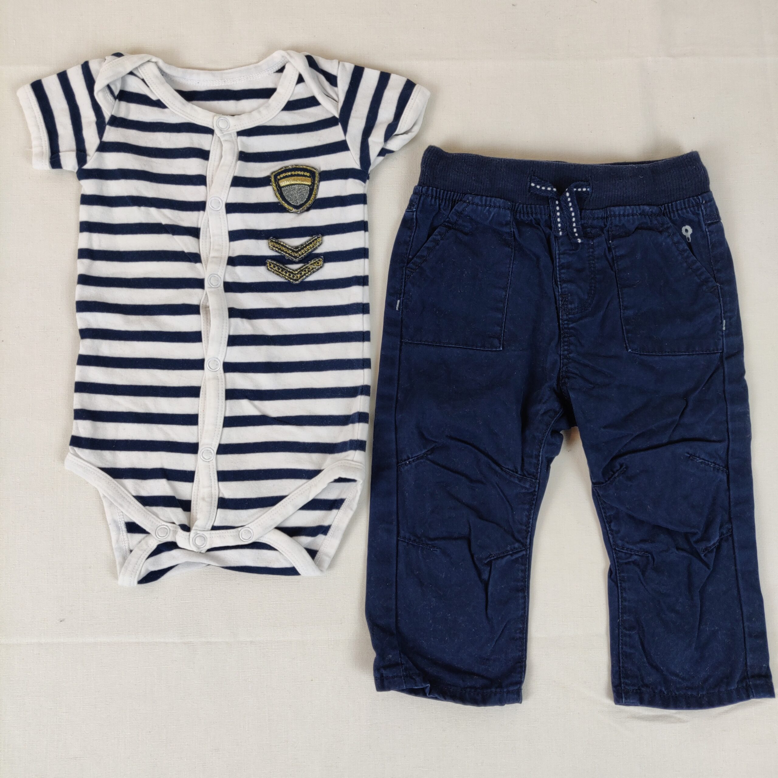 Autres commentaires : Pantalon bleu marine, taille élastiquée et ajustable par cordon. Body sans marque à manches courtes bleu marine et blanc rayé, contient de l’élasthanne, en parfait état.