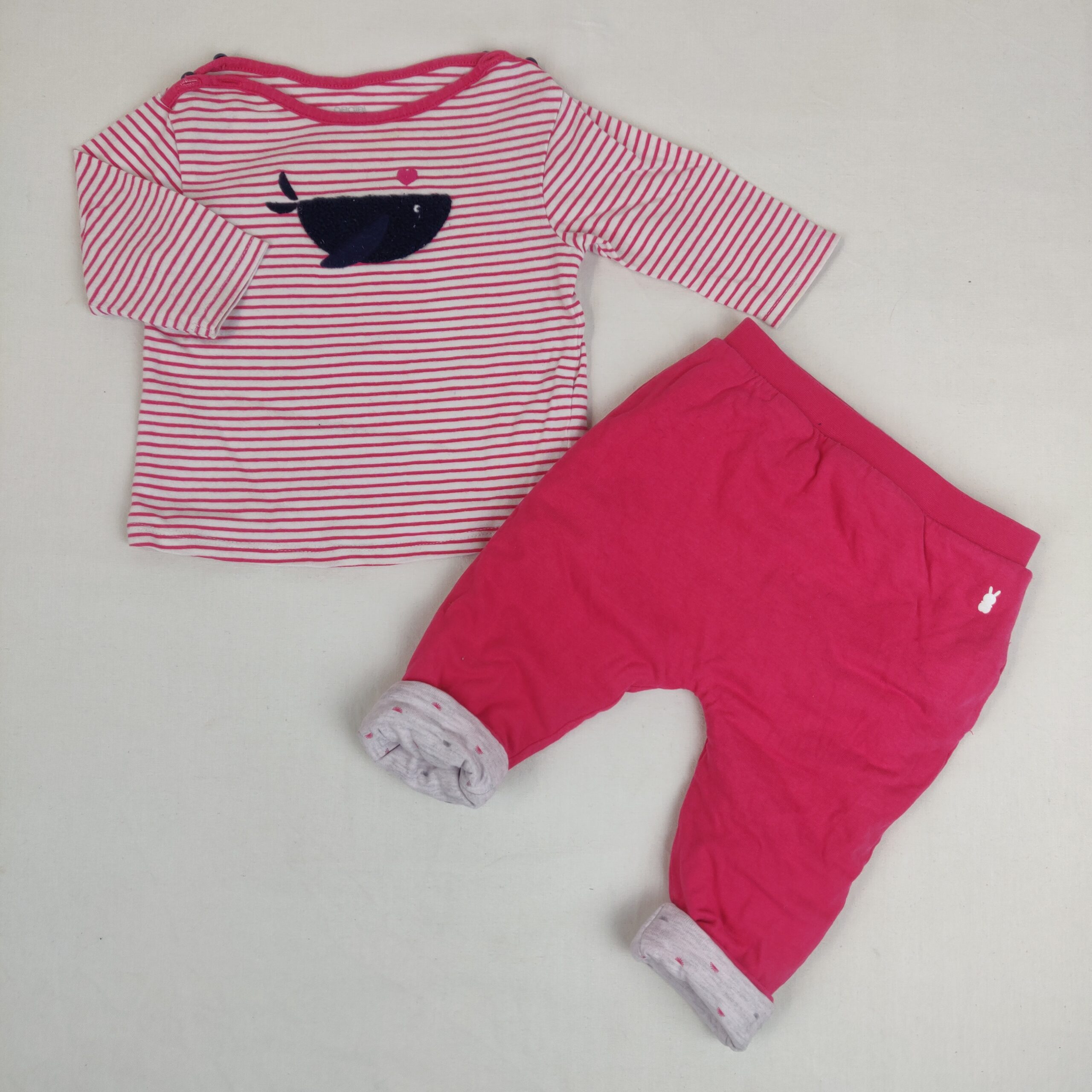 Autres commentaires : Ensemble 2 piéces. T-shirt rose manches longues avec des rayures roses horrizontales et des boutons sur les épaules et contient 95% de coton et 5% d’elasthanne. pantalon rose molletonné de jersey sans poches, contient 99% de coton et 1% de viscose.