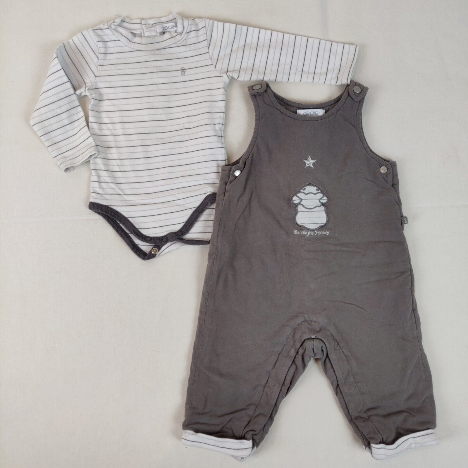 Autres commentaires : Salopette doublée grise (100% coton) à bretelles, fermeture par bouton pression à l’avant, motif ourson écru rayé gris clair et gris foncé. Ouvertures latérales à un bouton pression. Ouverture à l’entre-jambe à boutons pression. Chevilles retroussées. Body manches longues assorti – écru rayé gris clair et gris foncé. 3 boutons pression à l’entre-jambe et ouverture centrale au dos à 3 boutons pression.