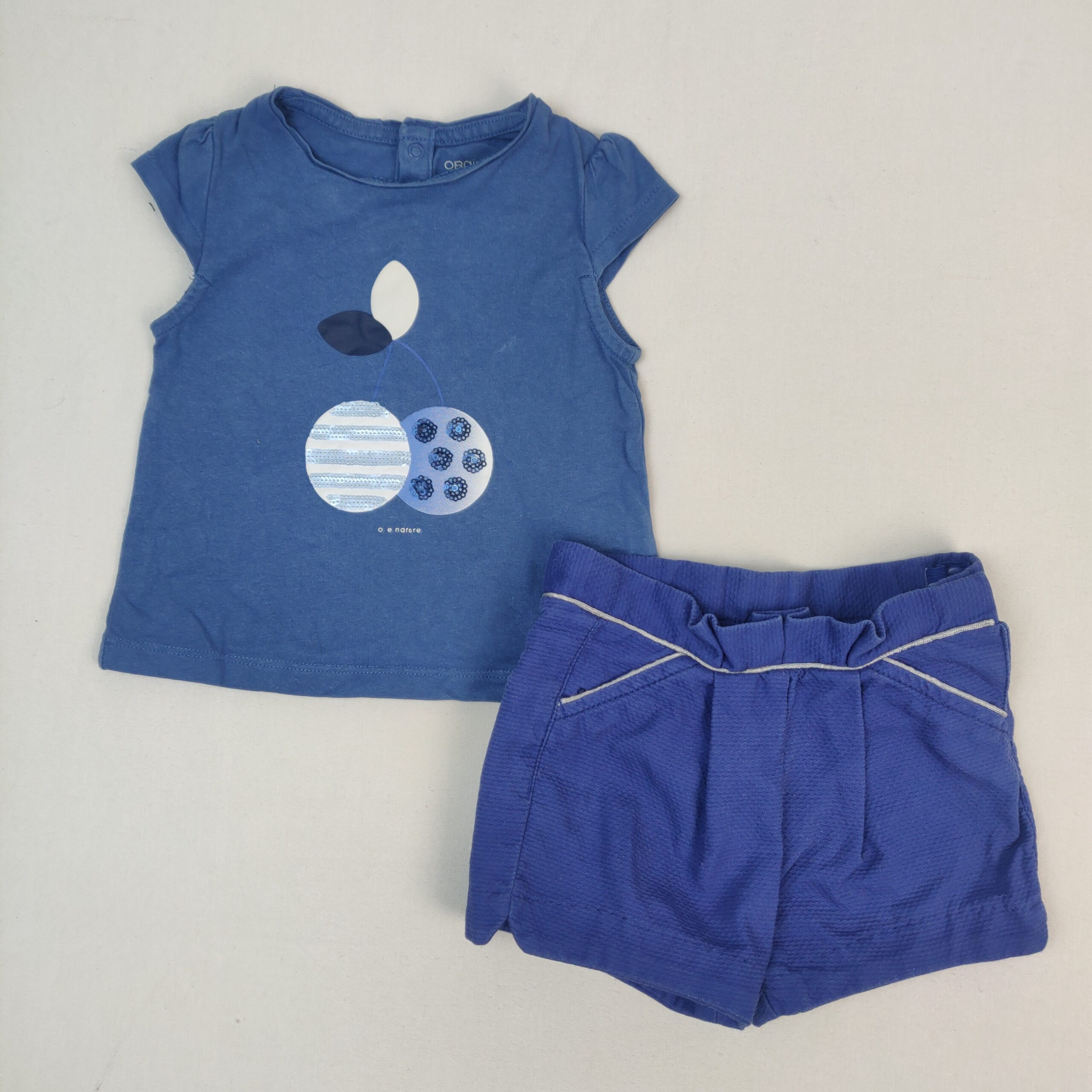 Autres commentaires : Ensemble 2 pièces : – T-shirt manches courtes, bleu ardoise, col rond, manches tres courtes un peu ballon, cerises bleues à sequins devant, fermeture par boutons pression au dos. – Short bleu indigo 100% coton, ceinture ajustable par élastique intérieur, fermeture par boutons pression sur le côté.