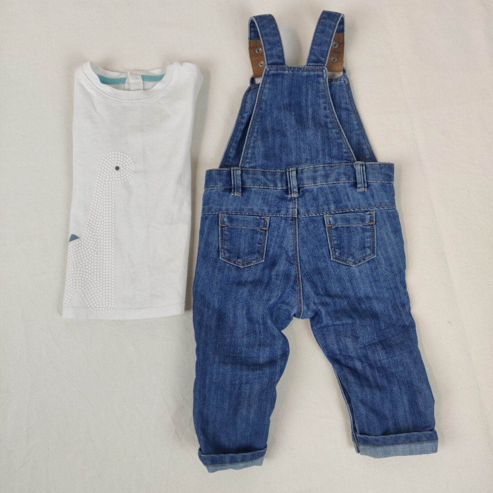 Autres commentaires : Ensemble 2 pièces. Un t-shirt à manches courtes – blanc avec motif central piqué dinosaure. Ouverture centrale au dos à pressions. Une salopette en denim bleu. Bretelles réglables à l’aide de pressions. Une pochette centrale. 2 poches latérales et 2 poches arrières.