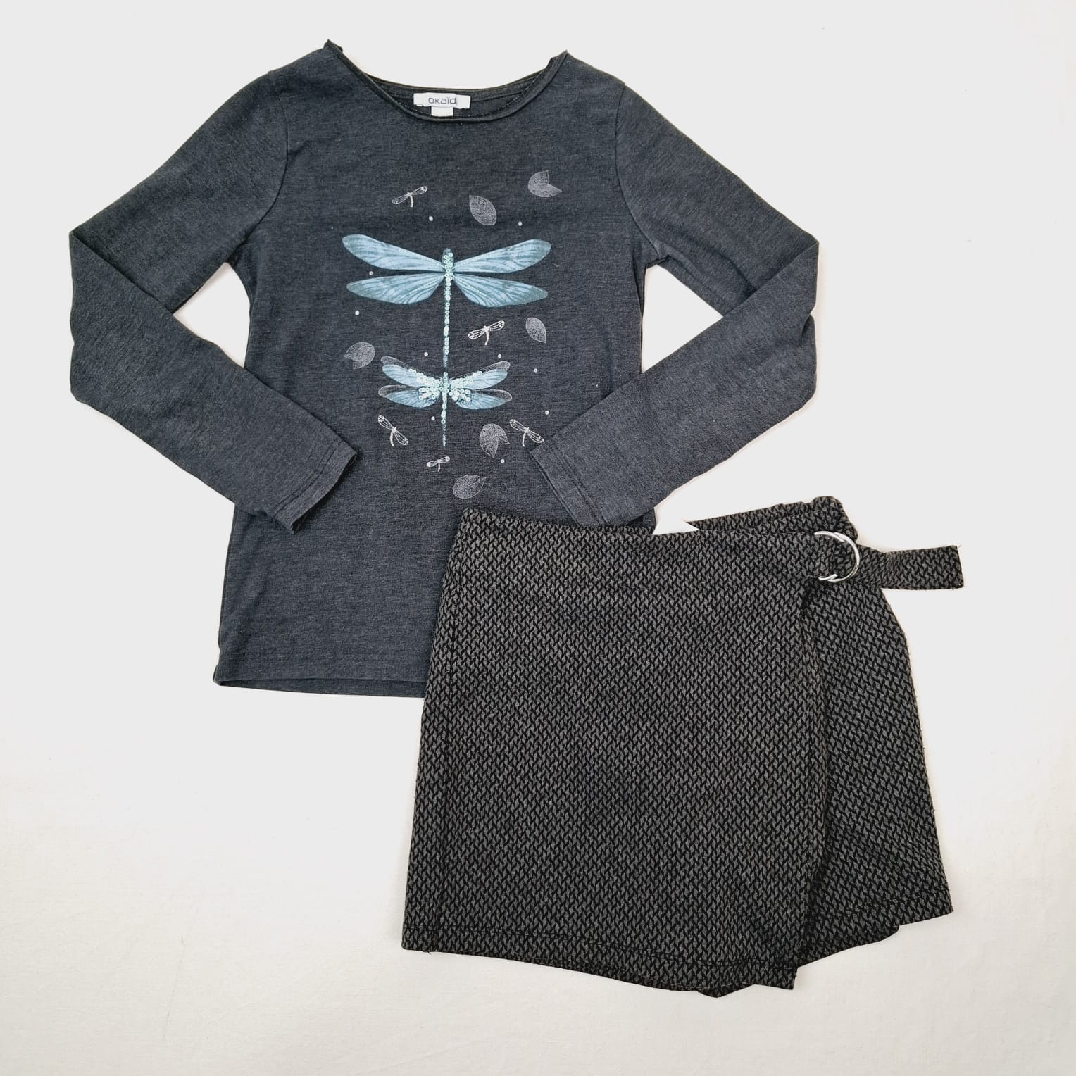 Autres commentaires : Ensemble t-shirt manches longues gris Okaïdi en coton majoritaire, motif libellule et jupe-short sans marque 2% élasthanne