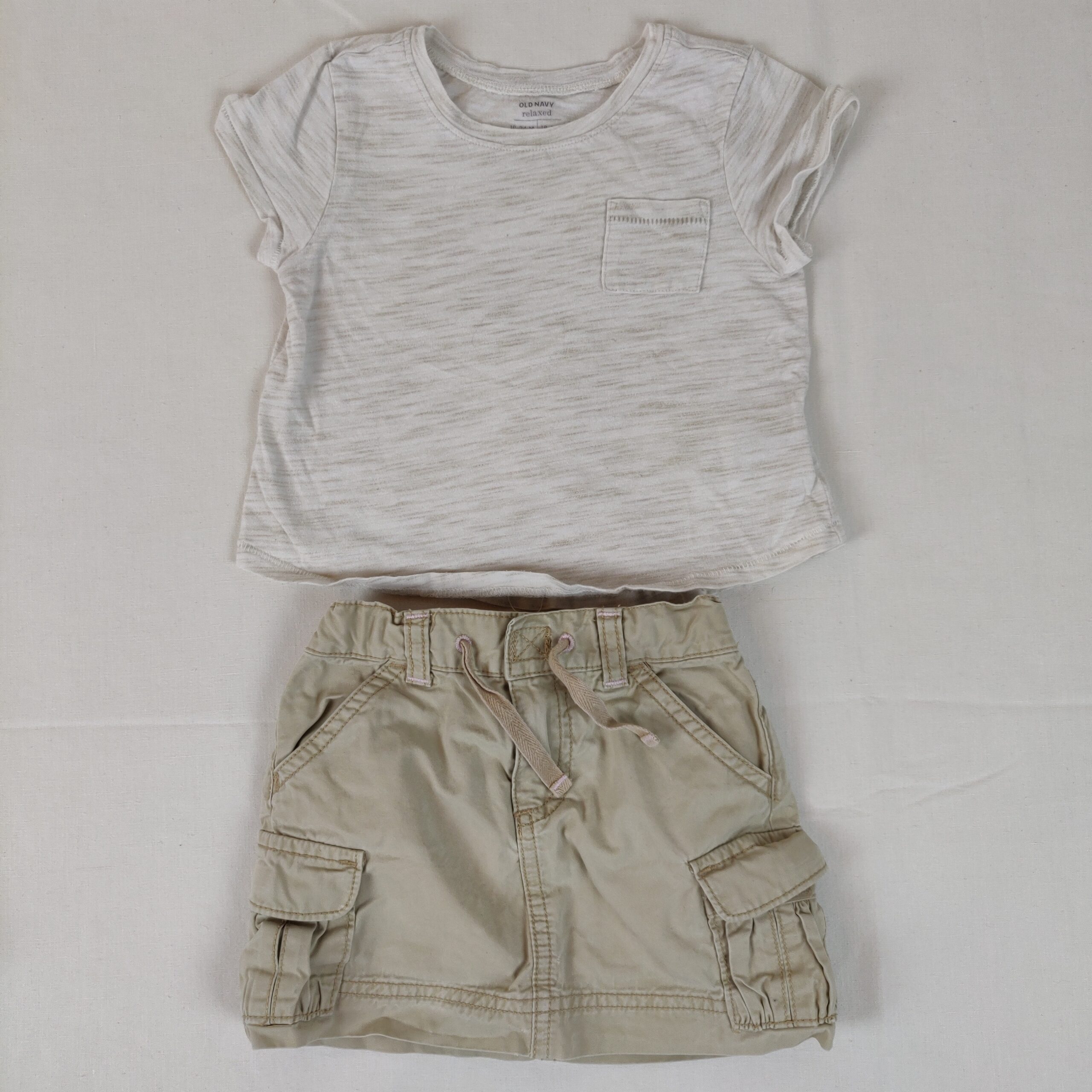 Autres commentaires : T-shirt beige chiné à manches courtes avec poche centrale. Usure normale du vêtement. Jupe – beige – taille ajustable avec cordon, ouverture centrale à fermeture éclair et scratch. 4 poches latérales dont 2 à rabat à scratch. 2 poches arrières. Passants pour une ceinture. Petit défaut : petit trou rappiécé dans un pli de la jupe et élastiques d’ajustement de la taille assez fatigués. Niveau réduit de fraise à myrtille.
