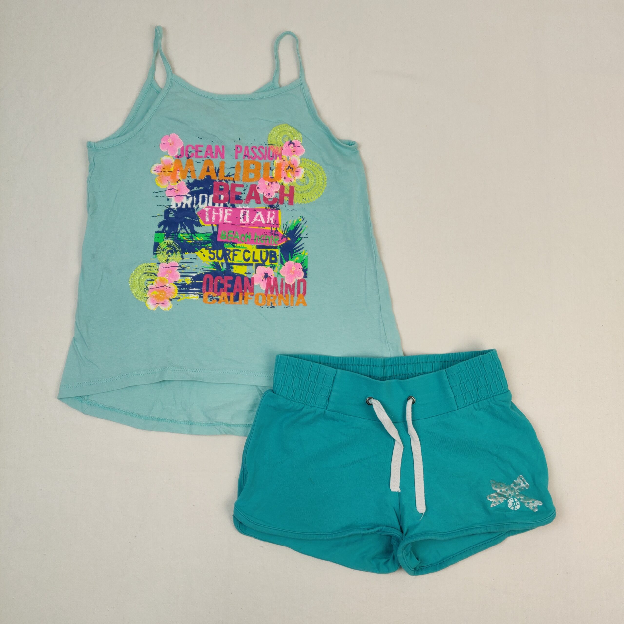 Autres commentaires : T-shirt à bretelles, vert opaline en jersey, inscriptions multicolores. Short vert turquoise taille élastiquée avec cordons blancs.