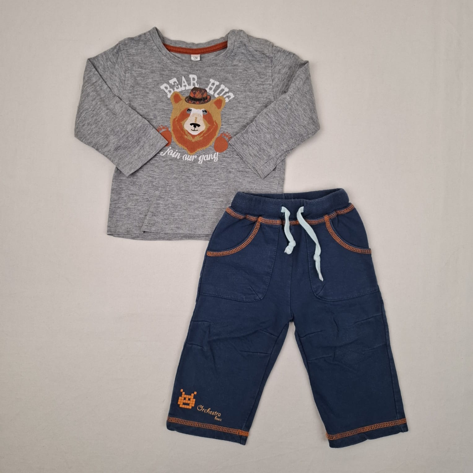 Autres commentaires : Ensemble 2 pièces Orchestra 12M composé d’un haut gris avec motifs ours col rond et un bas bleu taille élastiquée réglable 2 poches
