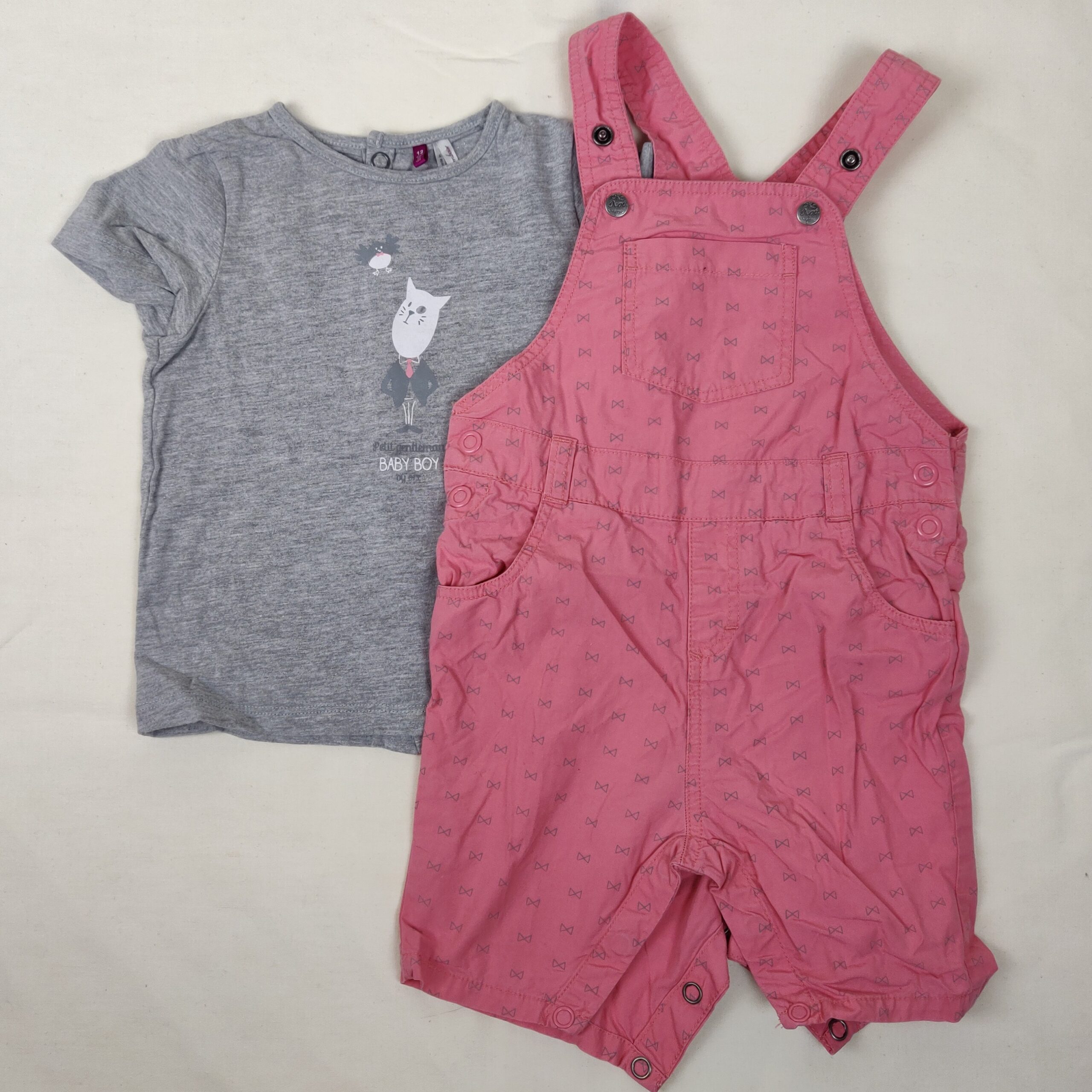 Autres commentaires : T-shirt manches courtes 10% polyester, fermé par boutnos pression au dos, motif « Petit Gentleman Baby Boy by Orc » et dessin de chat et oiseau à cravatte et noeud pap saumon. Salopette courte couleur suamon à noeuds pap gris.