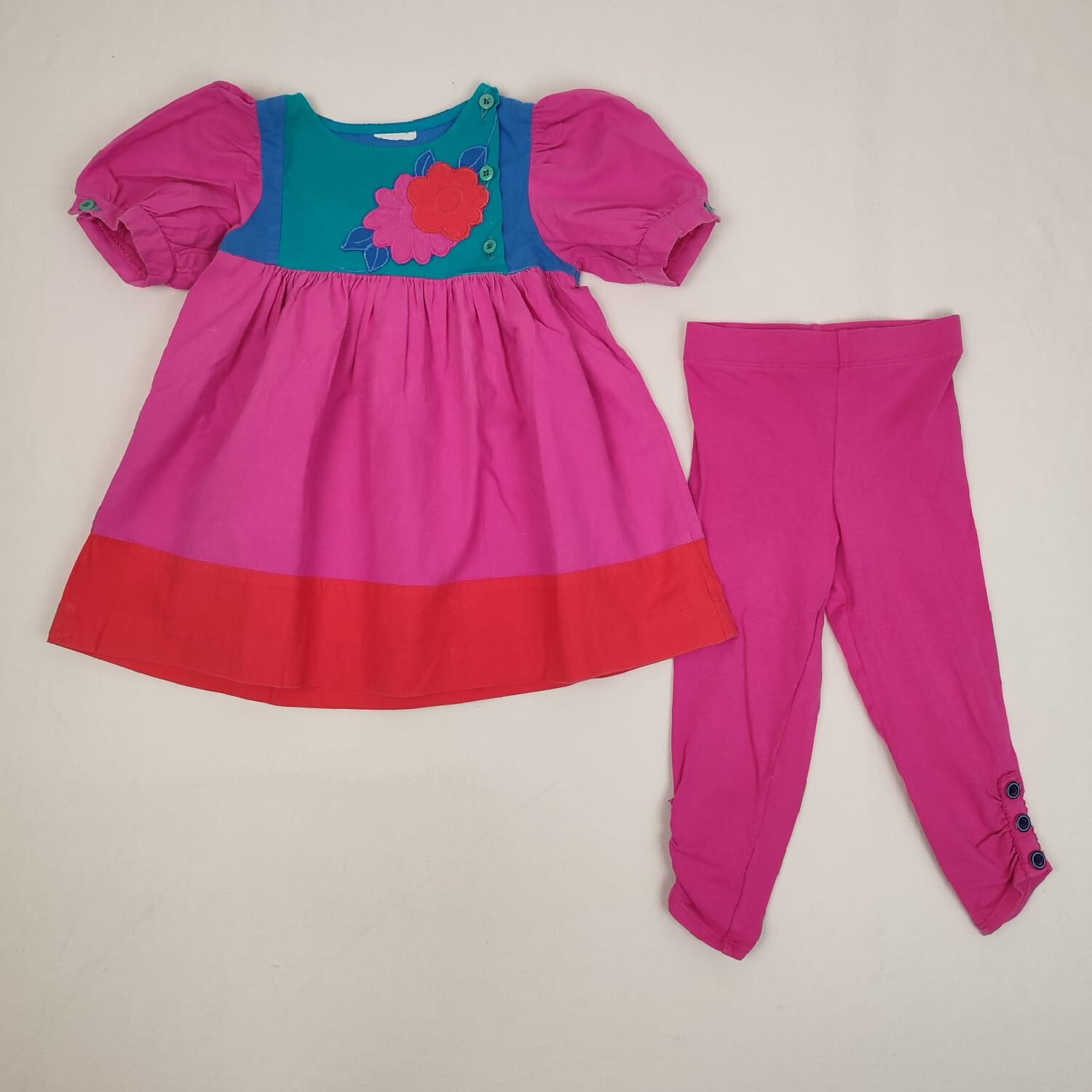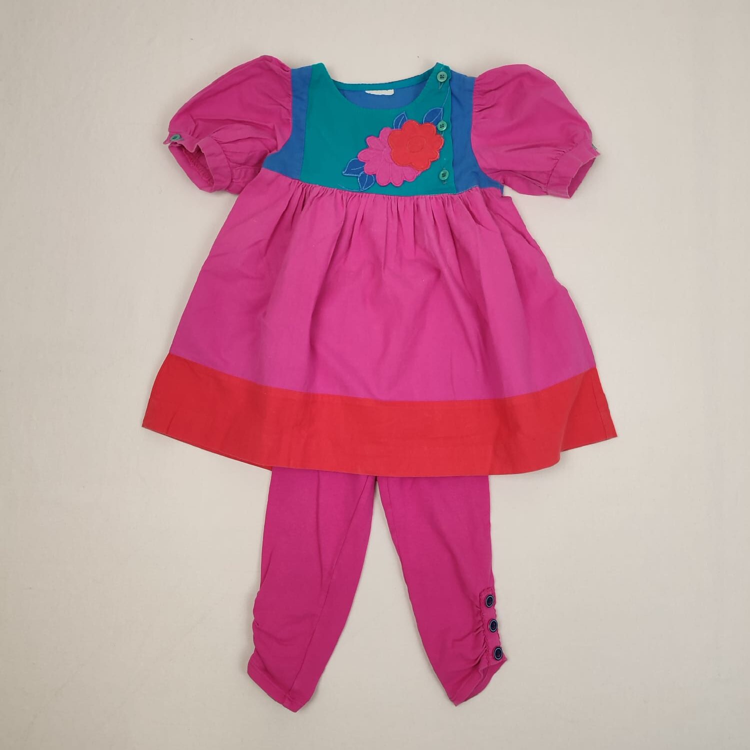 Autres commentaires : Ensemble 2 pièces : – Tunique rose fuchsia à petites manches ballon, sans marque, bande rouge en bas, col rond, motif fleurs sur l’encolure bleue et verte, fermeture devant par boutons à gauche du col. – Legging uni rose fuchsia ORCHESTRA, taille élastiquée.