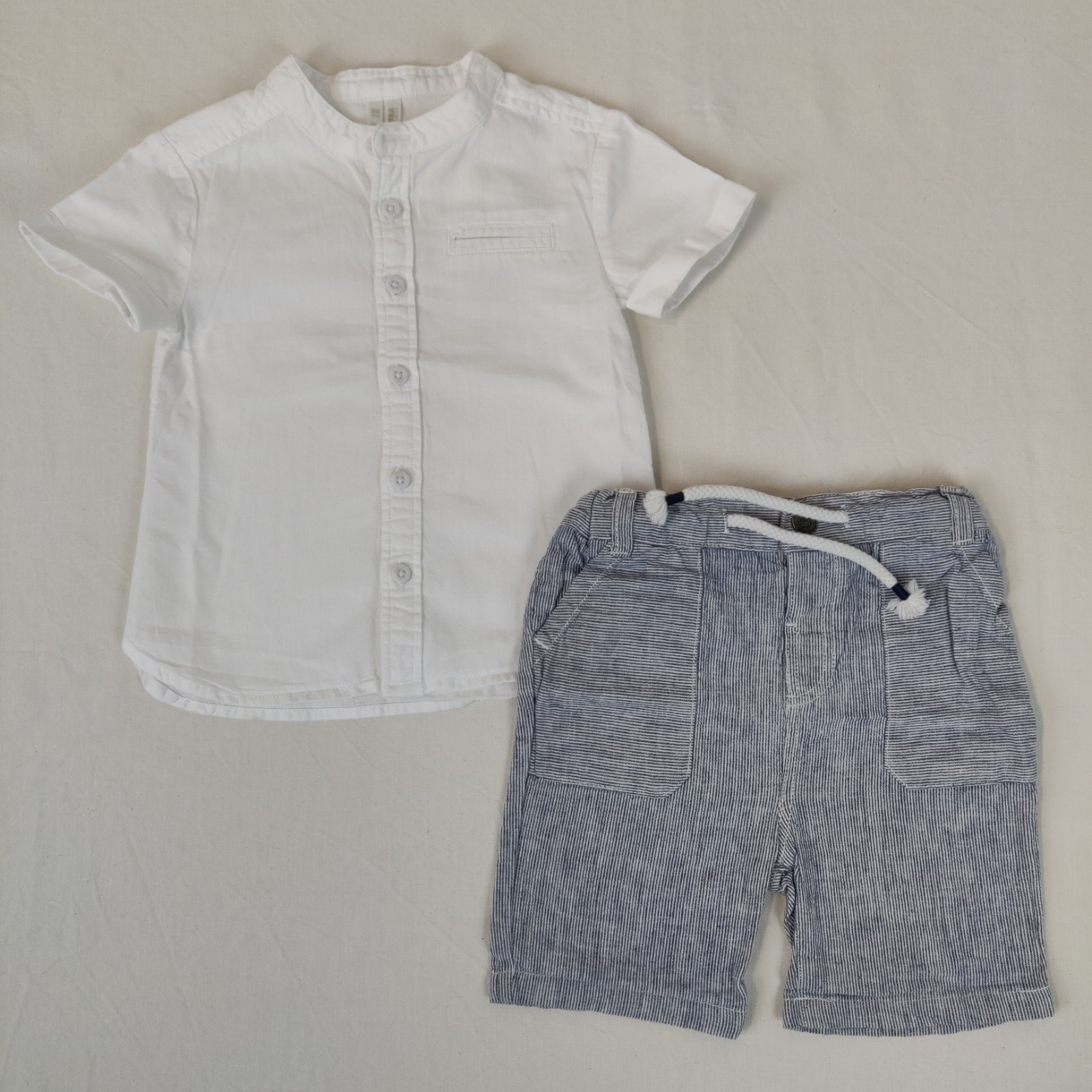 Autres commentaires : Ensemble 2 pièces. Une chemise à manches courtes – blanc. Pochette centrale. Ouverture centrale à boutons. Un bermuda finement rayé blanc et bleu marine. Taille ajustable avec cordon interne blanc. 2 grande poches latérales et une poche arrière.