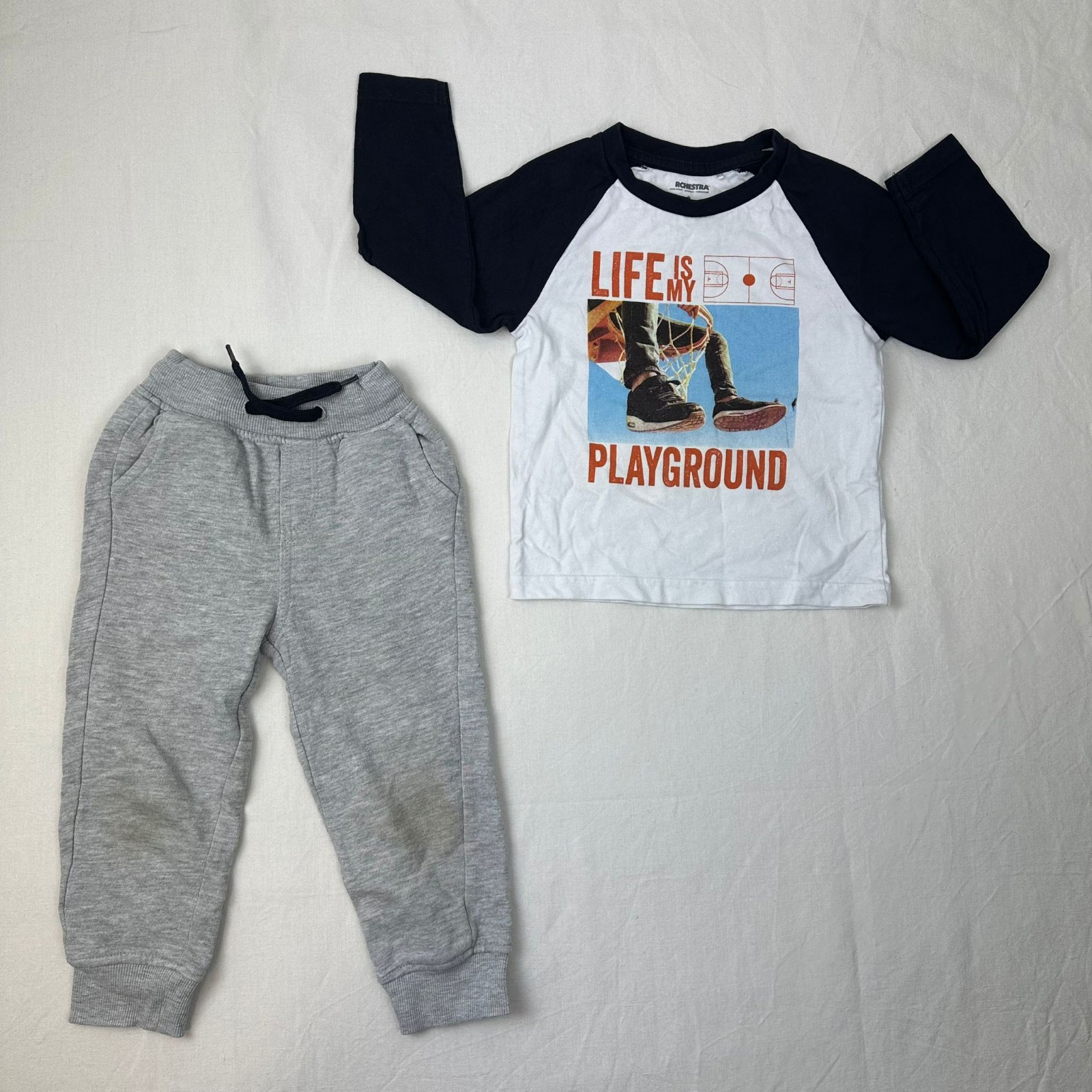 Autres commentaires : T-shirt blanc manches longues bleu foncé avec motif « Life is my Playground »orange et bleu. Pantalon Jogging gris avec taille élastiquée. Petit défaut: Pantalon jogging gris tachée aux genoux en marron.