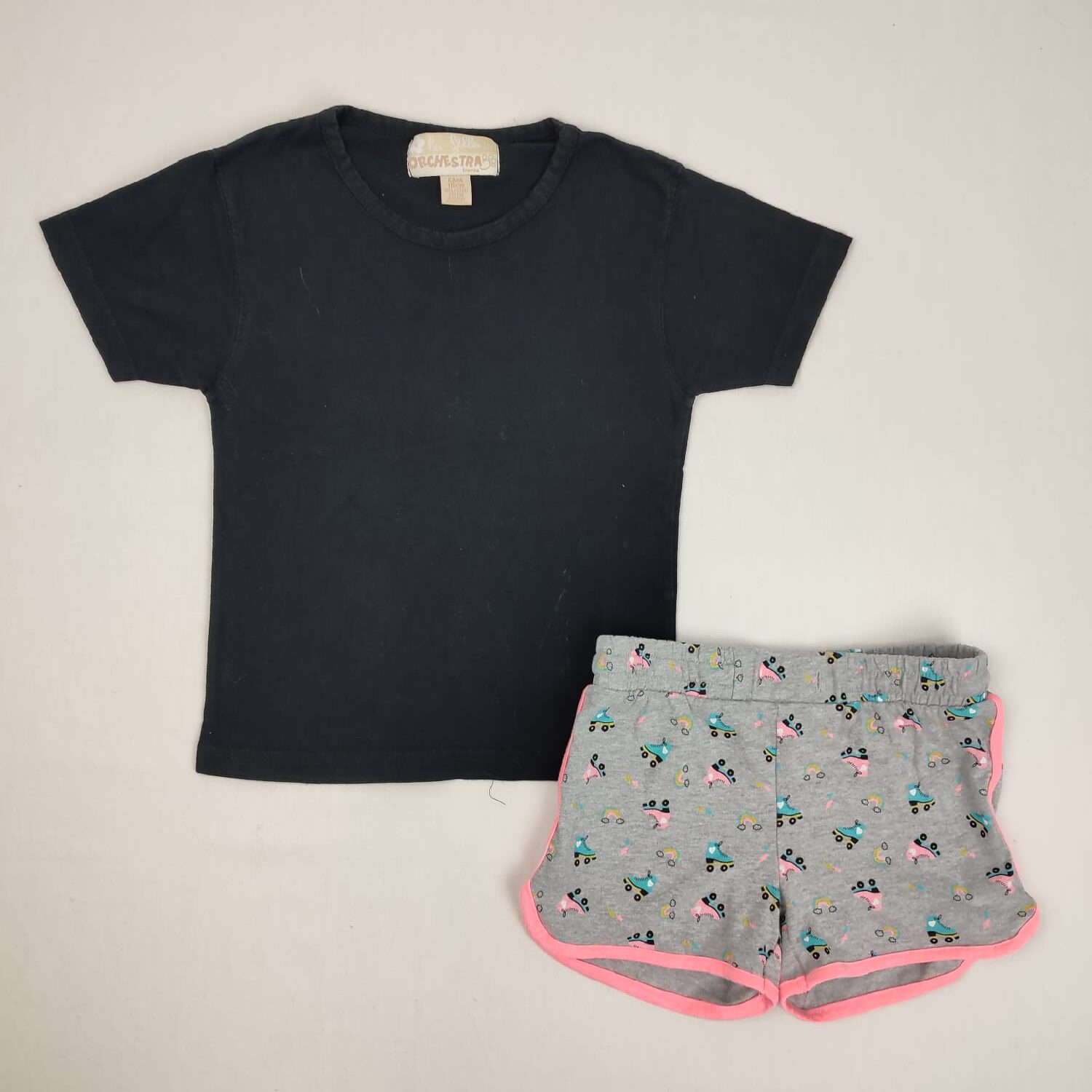 Autres commentaires : Ensemble short gris en jersey, liseré rose fluo, motifs patins à roulette bleus et roses, arc-en-ciel, taille élastique avec cordons et t-shirt noir uni en jersey 100% coton, à manches courtes, col rond.