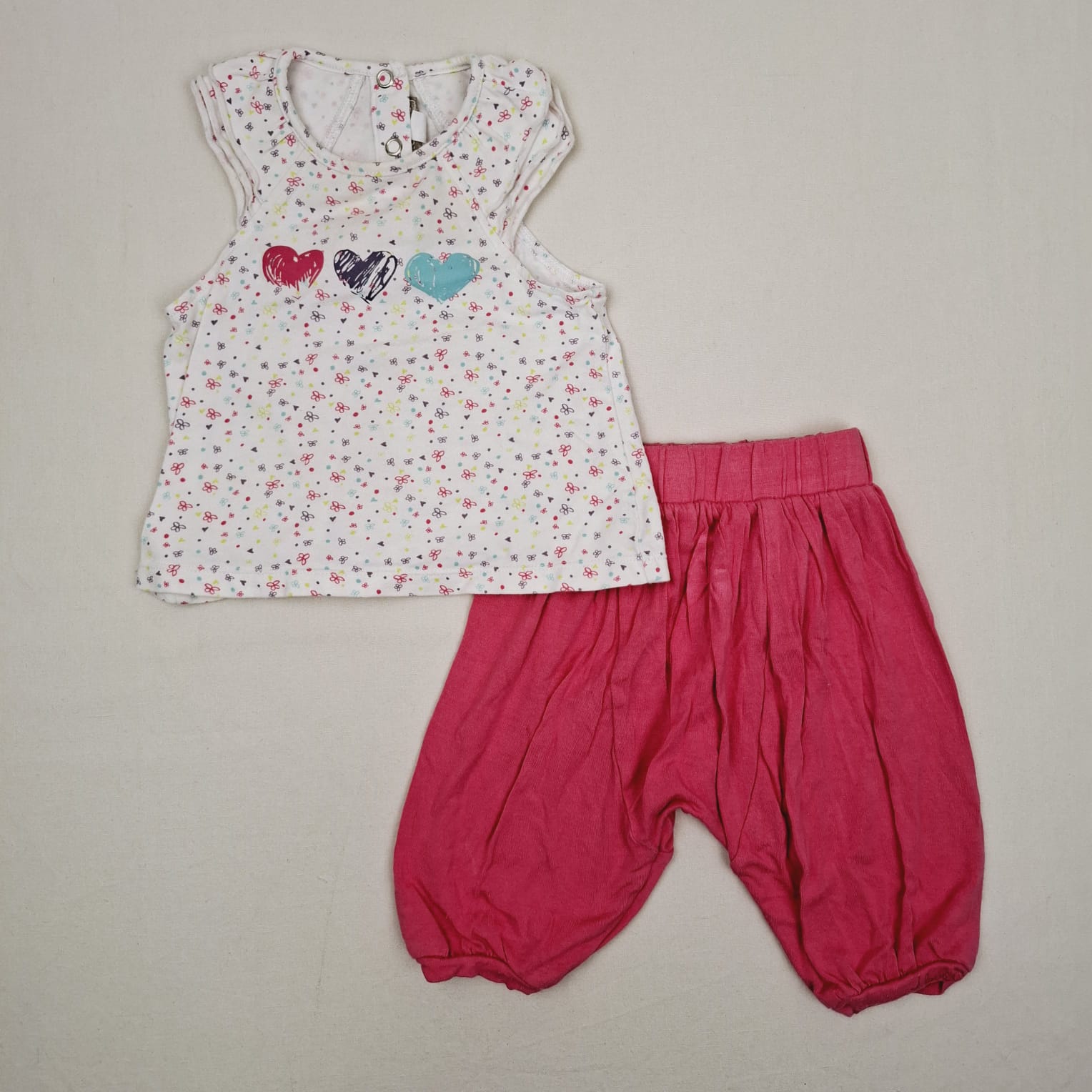 Autres commentaires : 5% élasthanne, Ensemble 2 pièces : – Un débardeur blanc avec des motifs de fleurs, fermeture par boutons au dos, – Un pantalon rose, taille élastiquée.