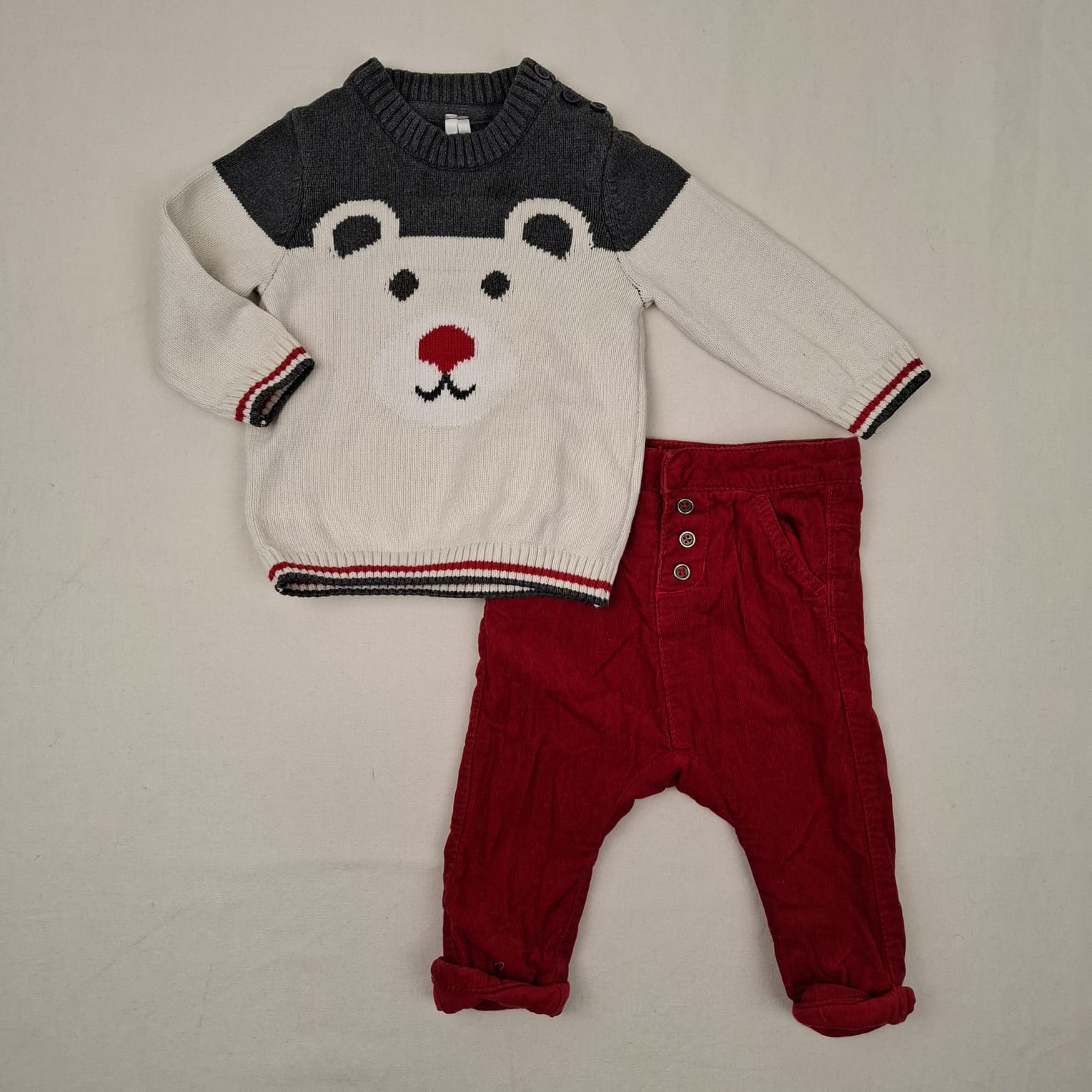 Autres commentaires : Ensemble 2 pièces: – Pull bicolore en maille, motif ours, encolure ronde en bord côte, ouverture boutonnée sur l’épaule, manches longues avec poignets et base en bord côte, liserés contrastés, 100% coton. – Pantalon en velours côtelé rouge, ceinture ajustable par élastique intérieur, fermeture par bouton, doublure en coton.