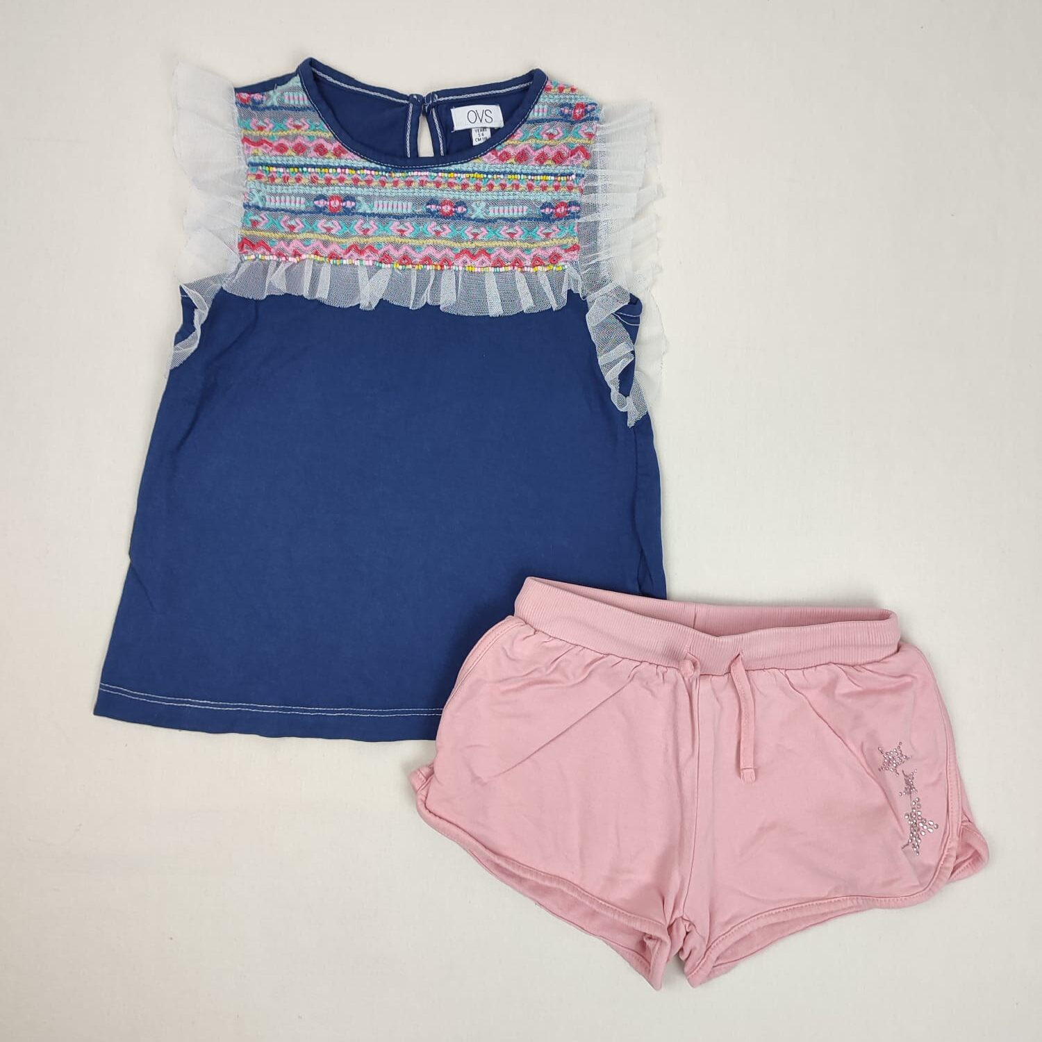 Autres commentaires : Ensemble short rose pêche en jersey 100% coton, étoiles en brillants sur le côté gauche, taille élastique avec cordons et t-shirt bleu marine en jersey 100% coton, sans manches, avec volants en tulle blanc, plastron devant constitué de frises multicolores (100% polyester), fermeture par un bouton classique en haut du dos.