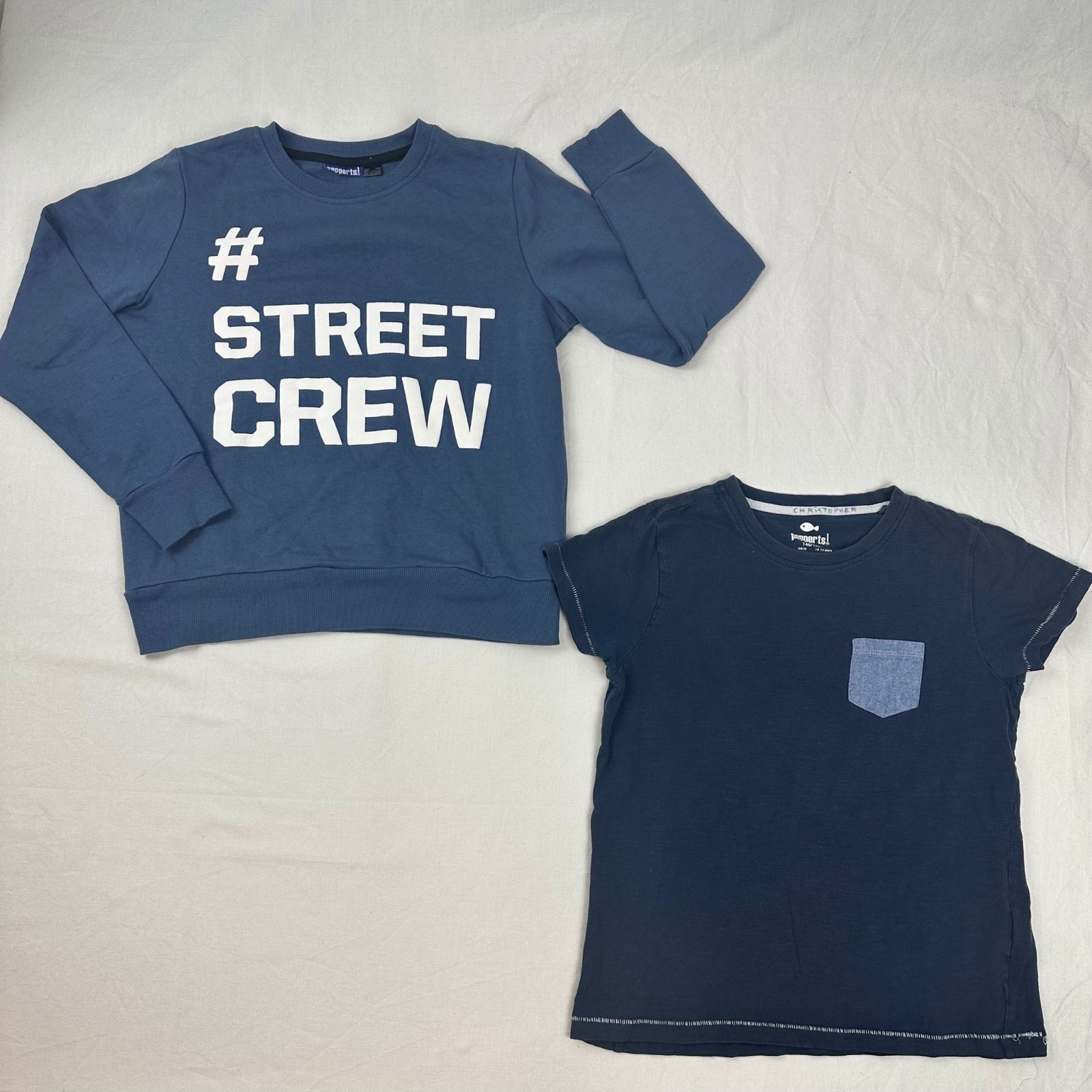 Autres commentaires : T-shirt manches courtes bleu foncé avec une poche devant. Sweat bleu avec motif « street crew » blanc.