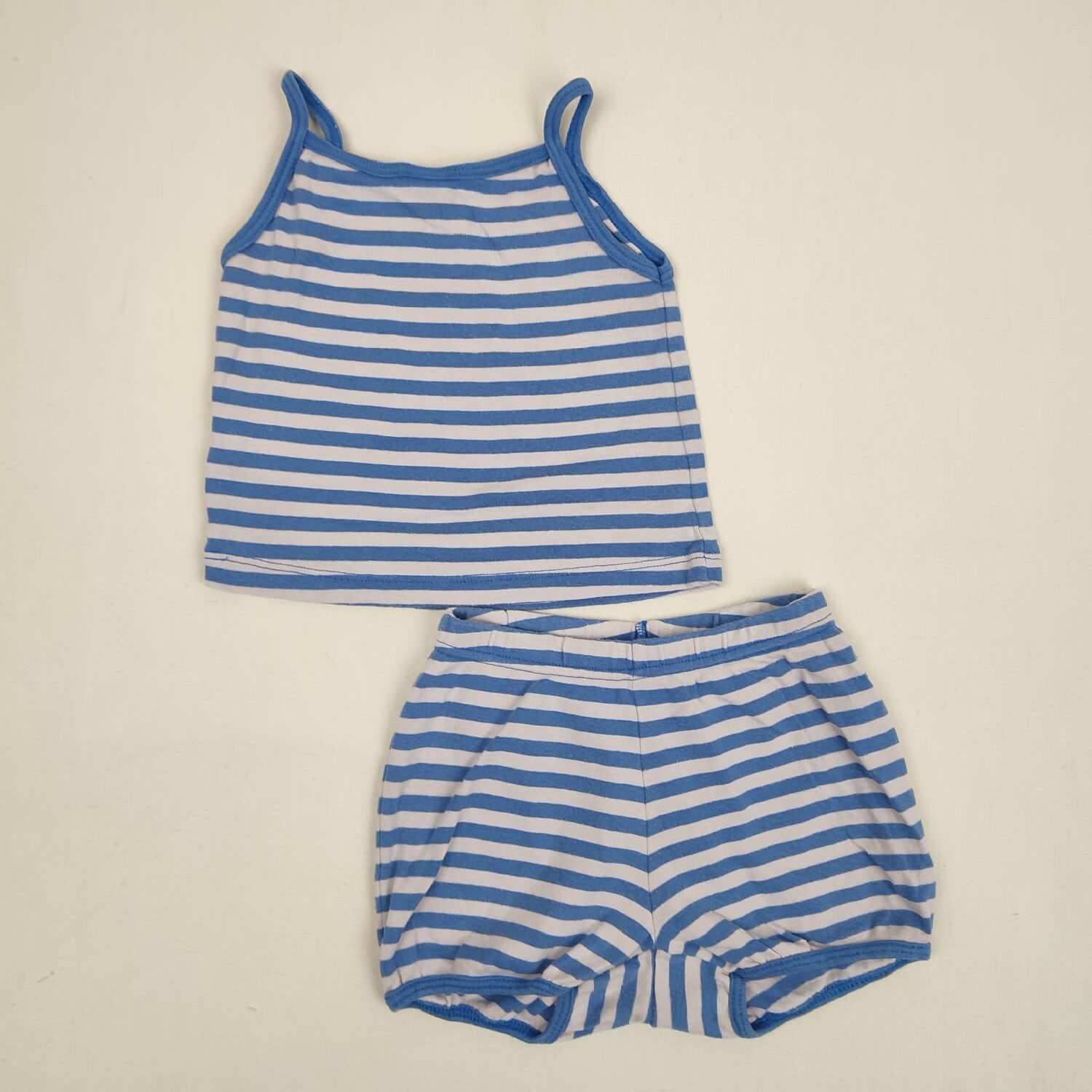 Autres commentaires : Ensemble 2 pièces : – T-shirt à bretelles et short assorti à rayures bleues et blanches, élastiqué au niveau des cuisses.