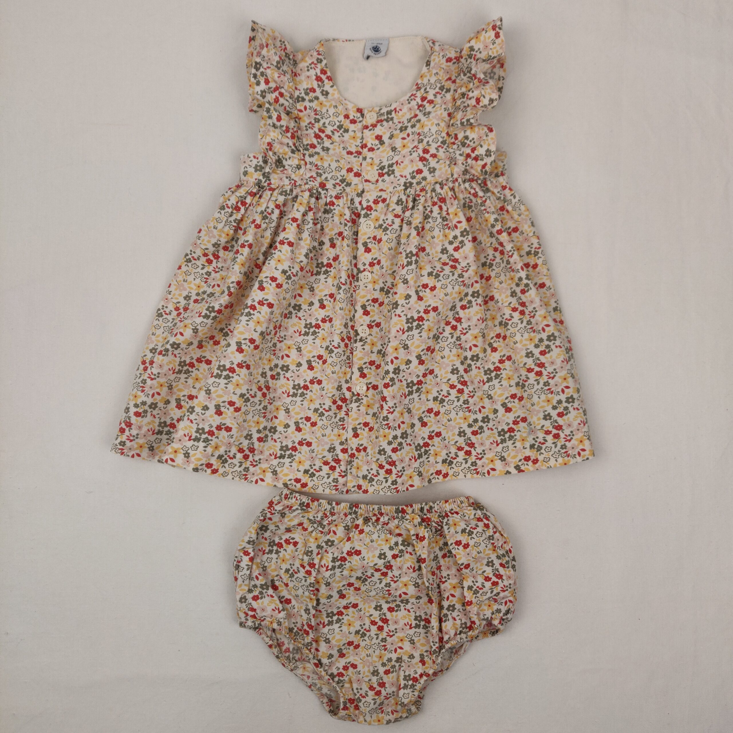 Autres commentaires : Ensemble 2 pièces : – une blouse manches courtes avec volants, devant fermeture par bouton, col rond, motifs parsemé de fleurs en rouge, jaune, rose et vert ; – une culotte, taille et bas élastique, motifs dans le ton de blouse.