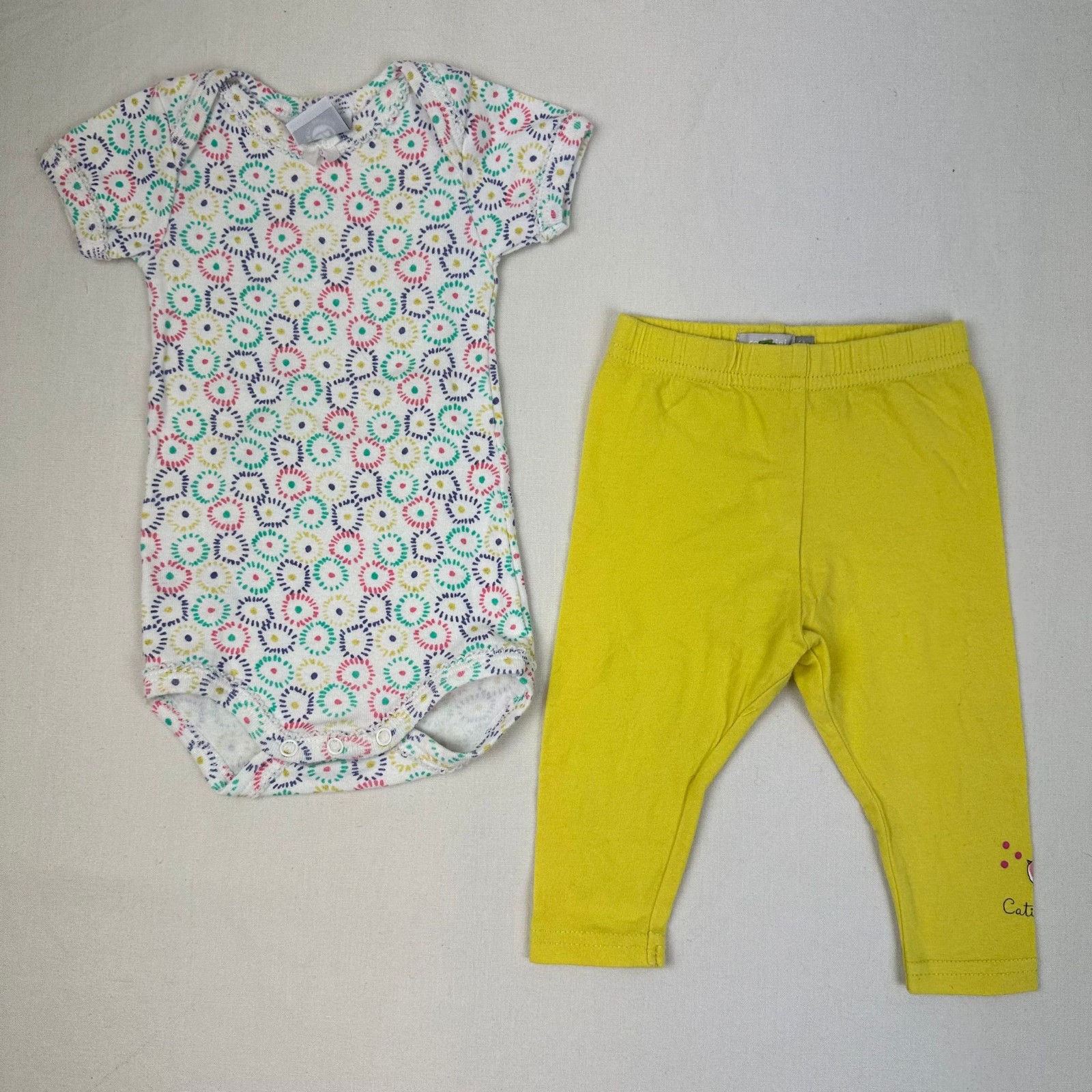 Autres commentaires : Body blanc Petit Bateau en multicolore manches courtes. Legging jaune Catimini avec taille élastiquée.
