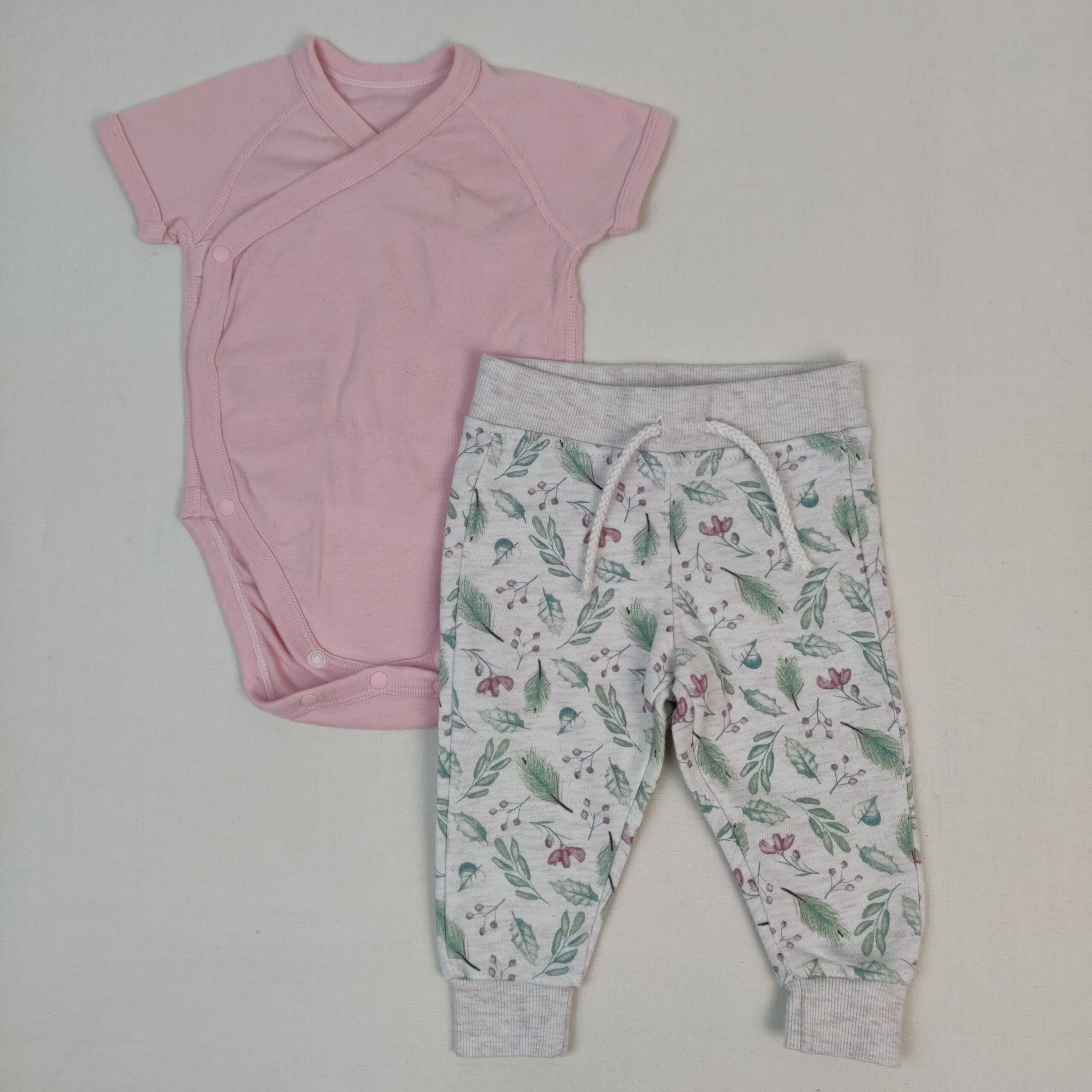 Autres commentaires : Ensemble 2 pièces : – Body manches courtes rose sans marque, minuscule tache en haut. – Pantalon blanc Primark, 52% coton, 48% polyester, motifs feuillages, taille élastiquée.