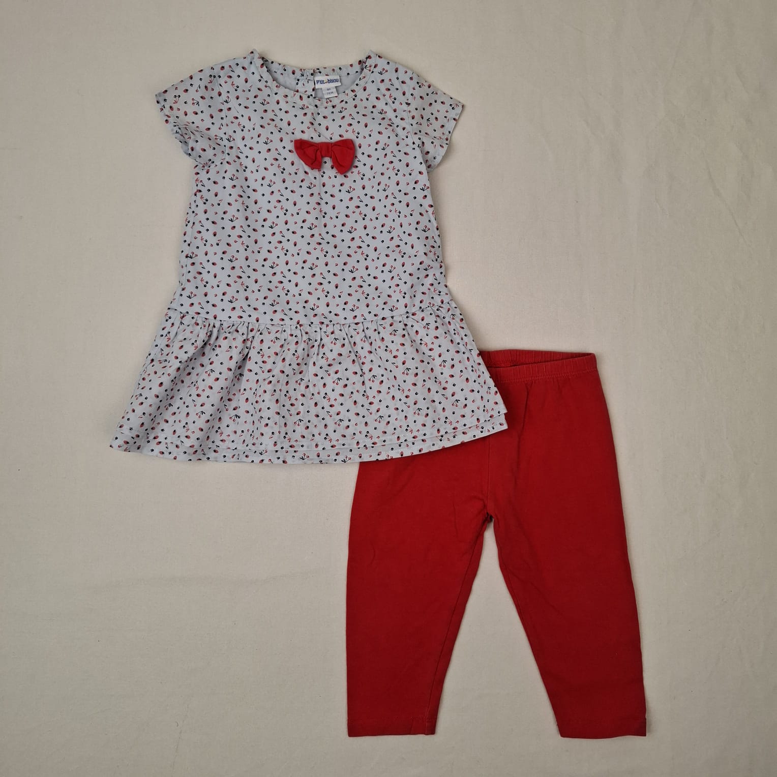 Autres commentaires : Ensemble 2 pièces: -Robe bleu clair à manches courtes, motif fruits, col rond, fermeture par boutons pression au dos, noeud rouge devant, doublure en 100% coton. -Legging rouge, taille élastique, 5% élasthanne.