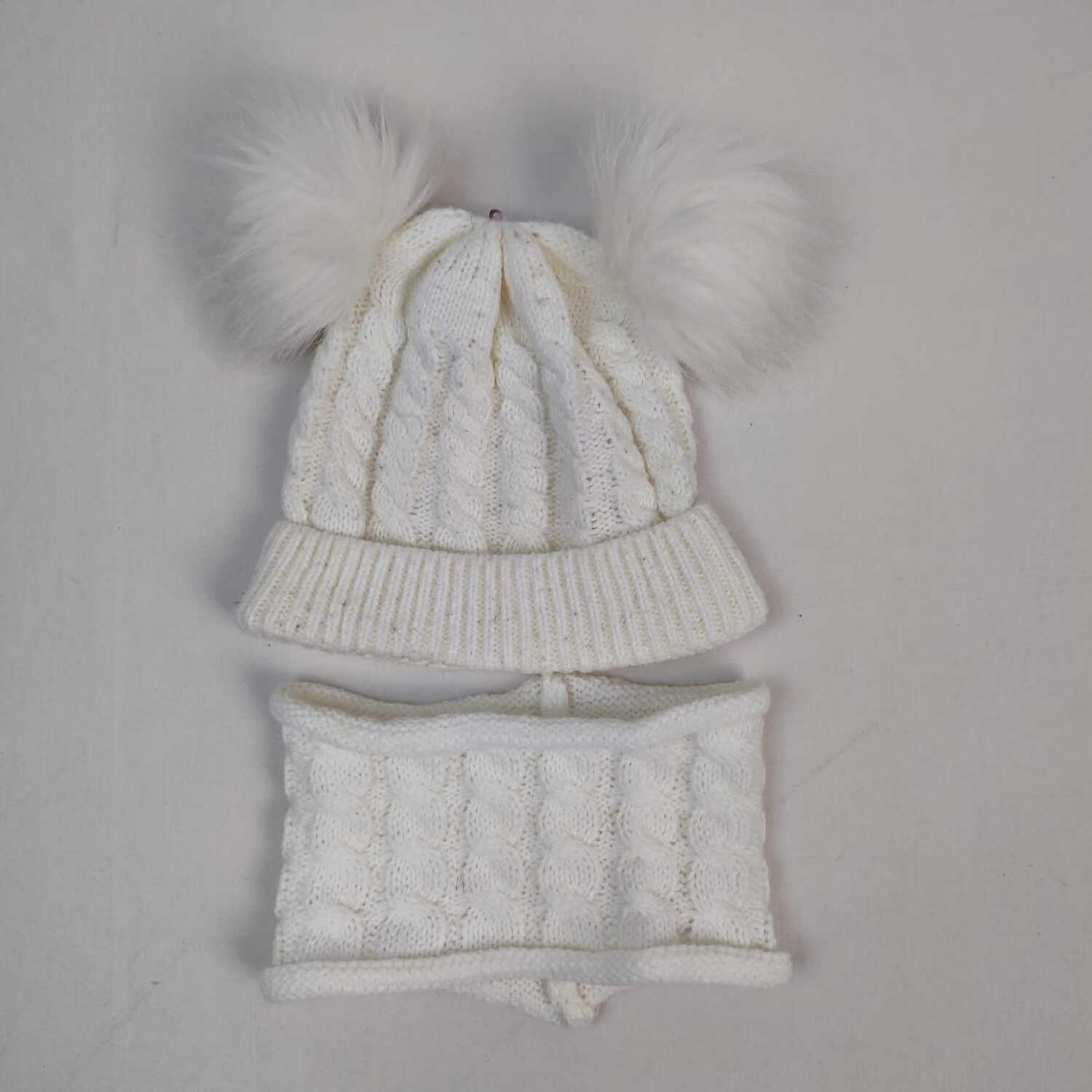 Autres commentaires : Ensemble blanc crème en maille dont 1 cache-cou et 1 bonnet avec pompons – taille estimée 48 cm de tout de tête.