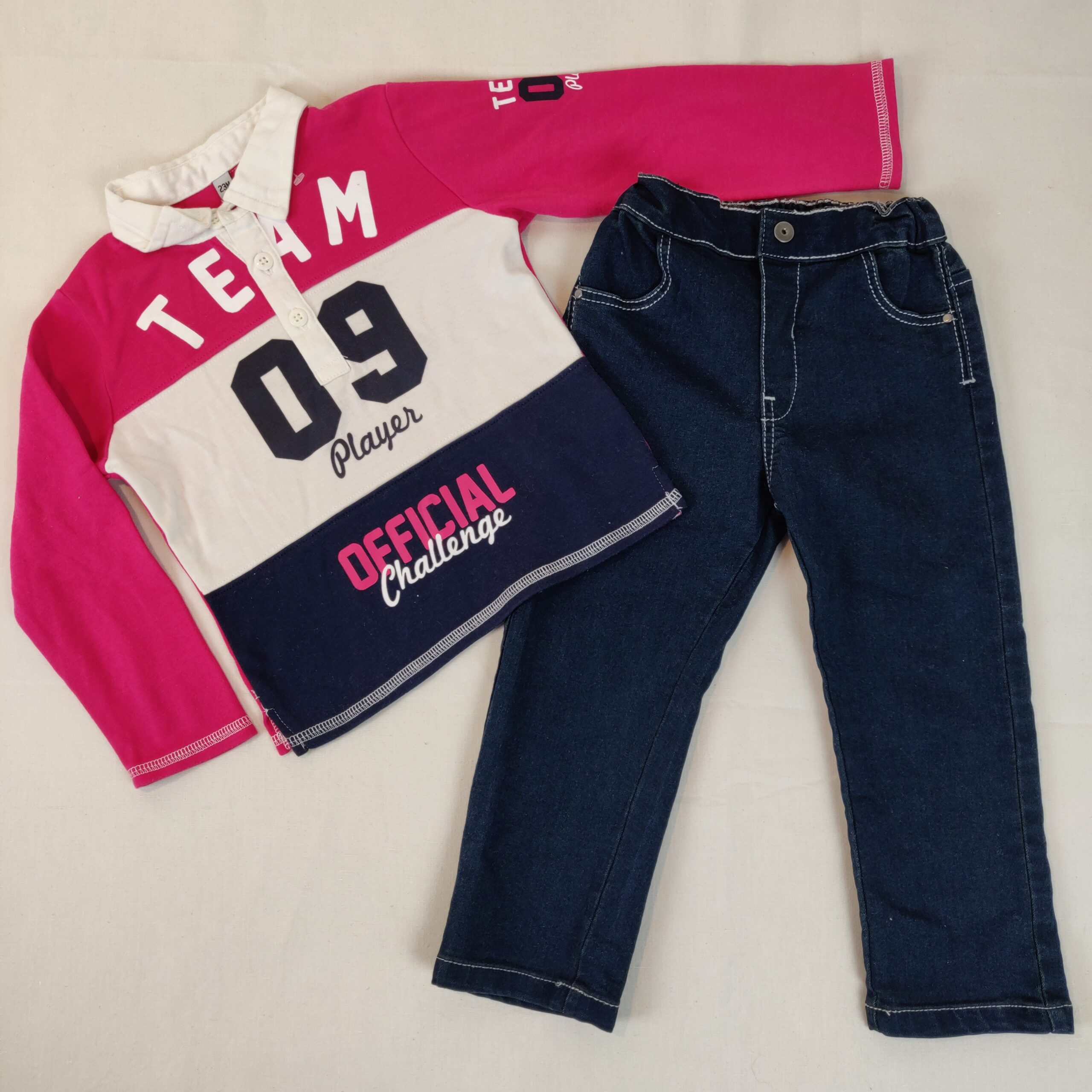 Autres commentaires : Polo à manches longues tricolore : bandes rose, blanche et bleu marine. Ouverture centrale à partir du col à 3 boutons classiques. Inscription centrale « Team 09 player official challenge ». Liseré blanc en surpiqure aux poignets et à la taille. Jean bleu foncé (coton majoritaire, 25% polyester, 2% élasthanne) – taille élastique. Ouverture centrale à partir de la taille à un bouton pression.