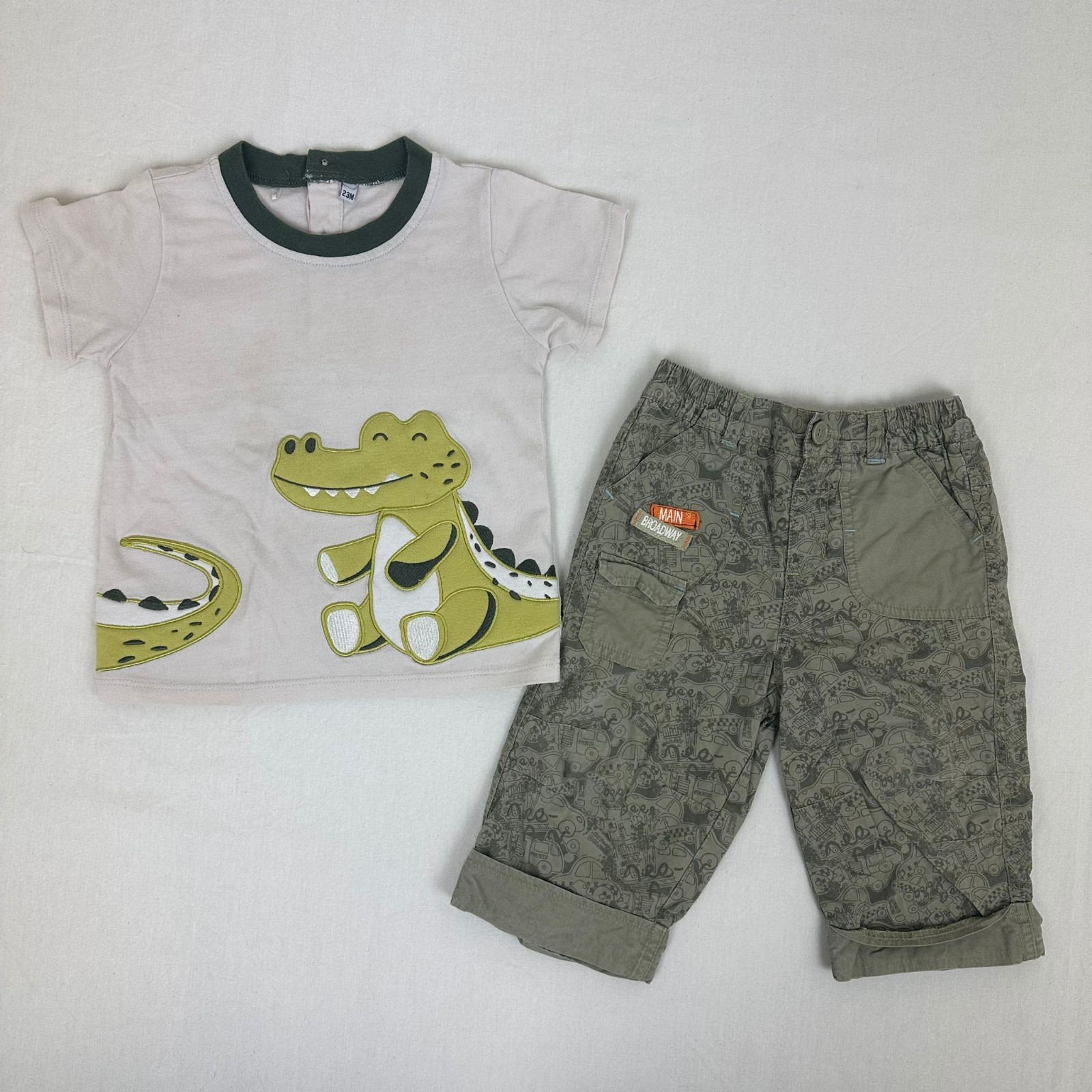 Autres commentaires : 41% polyester. T-shirt manches courtes beige sans marque avec bordure du col vert. Pantalon sans marque vert militaire avec taille élastiquée.