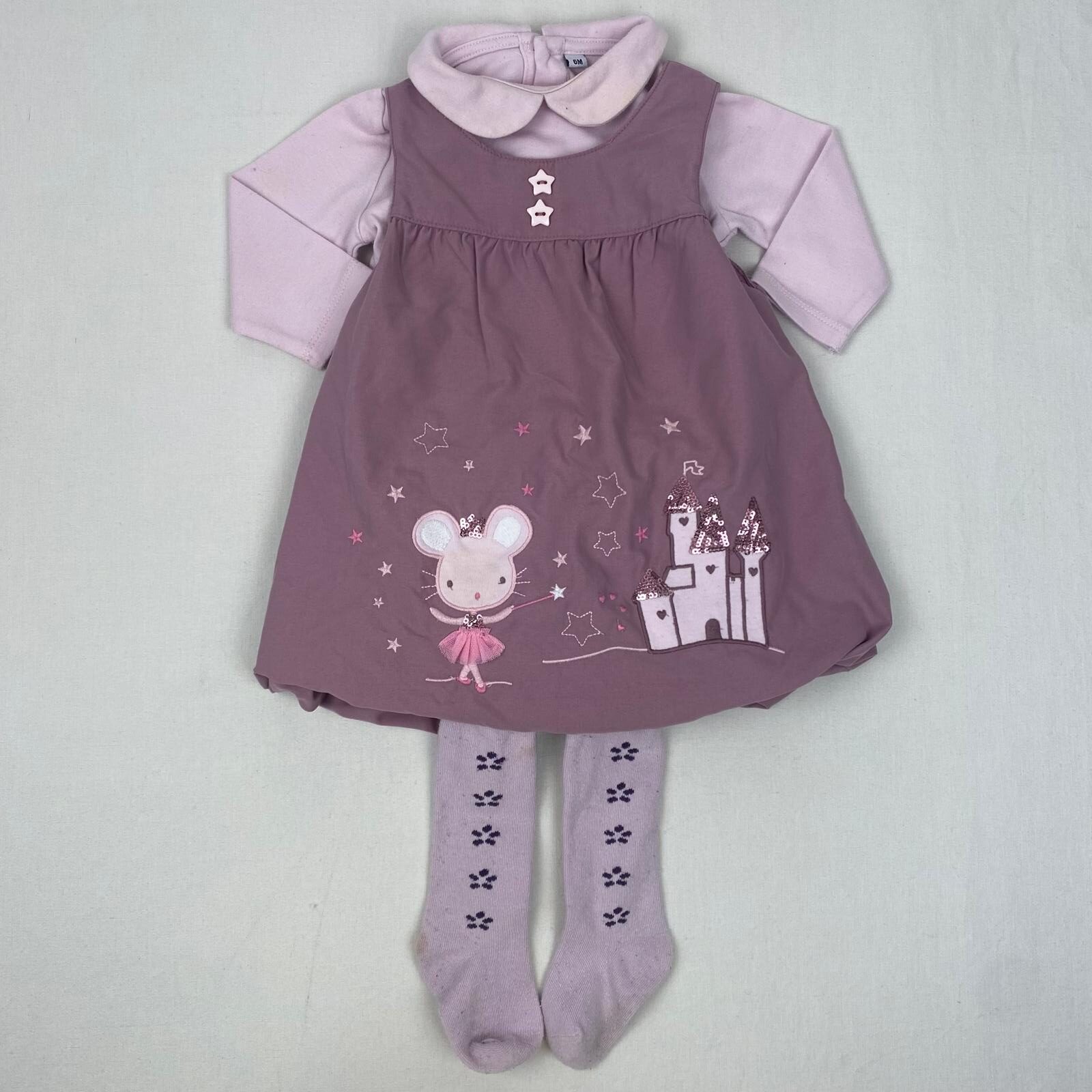 Autres commentaires : Ensemble 2 pièces : – Un t-shirt rose à manches longues, col chemise, fermeture par boutons au dos, – Une robe sans manches, fermeture par zip au dos, collant offert