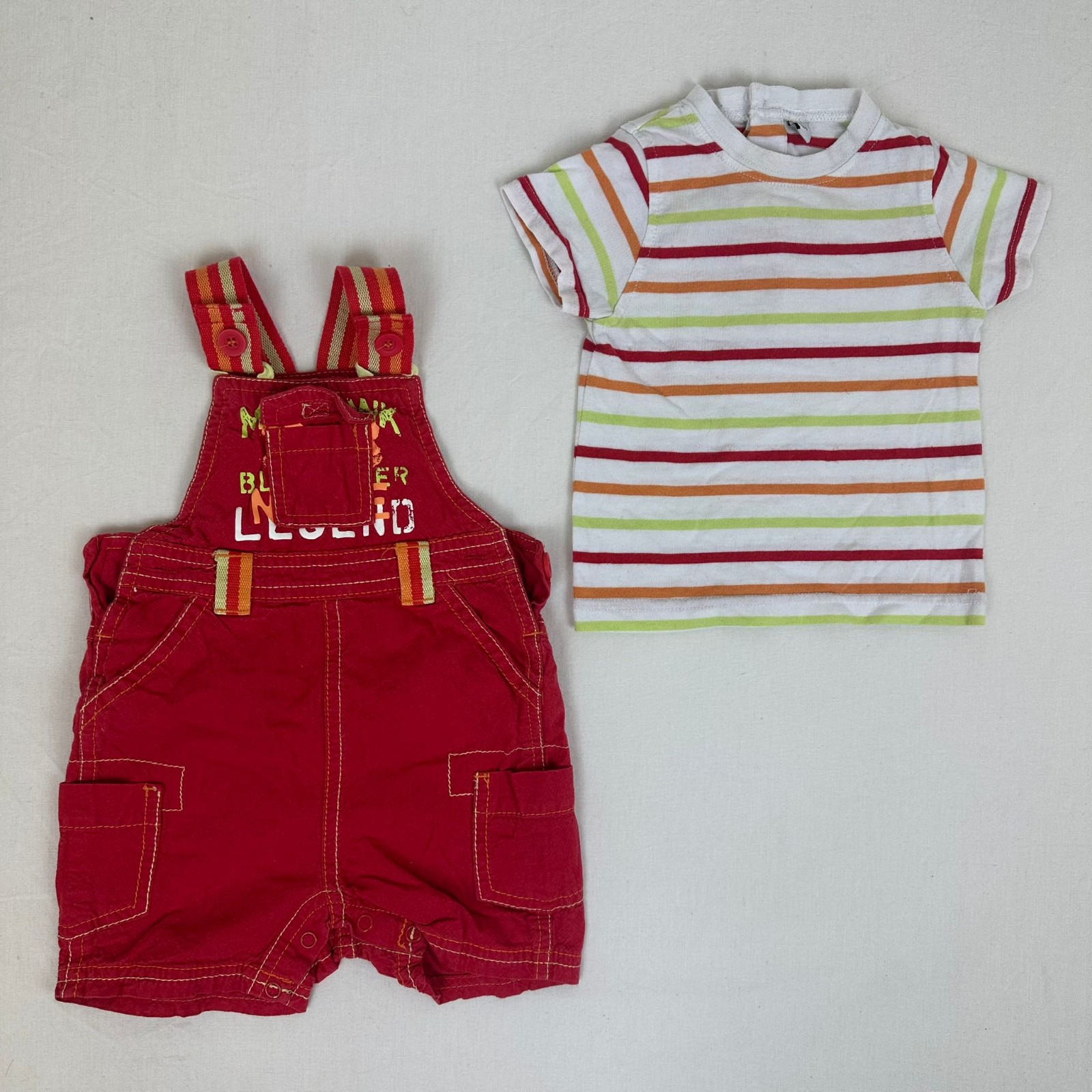 Autres commentaires : 40% polyester. T-shirt manches courtes blanc à rayures rouge,orange et vert avec une fermeture au dos par boutons pressions. Salopette short rouge avec une fermeture à la taille par boutons.