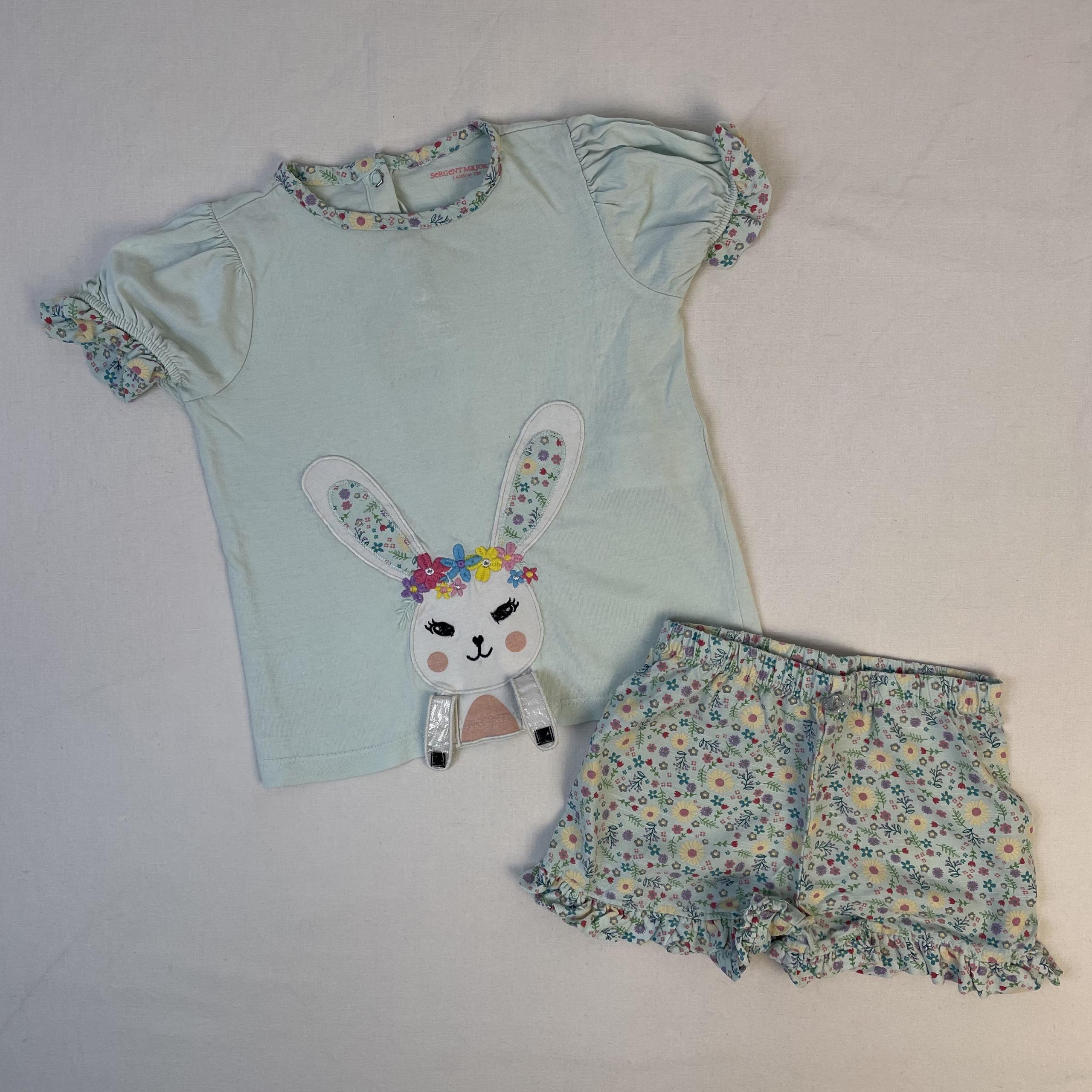 - T-shirt manches courtes assorti vert clair, rappel de l’imprimé au niveau des bordures, manches ballon, devant motif lapin blanc cousu avec des fleurs colorées, les bras du lapin se scratchent au niveau de ses yeux, fermeture en haut du dos par boutons pression.
