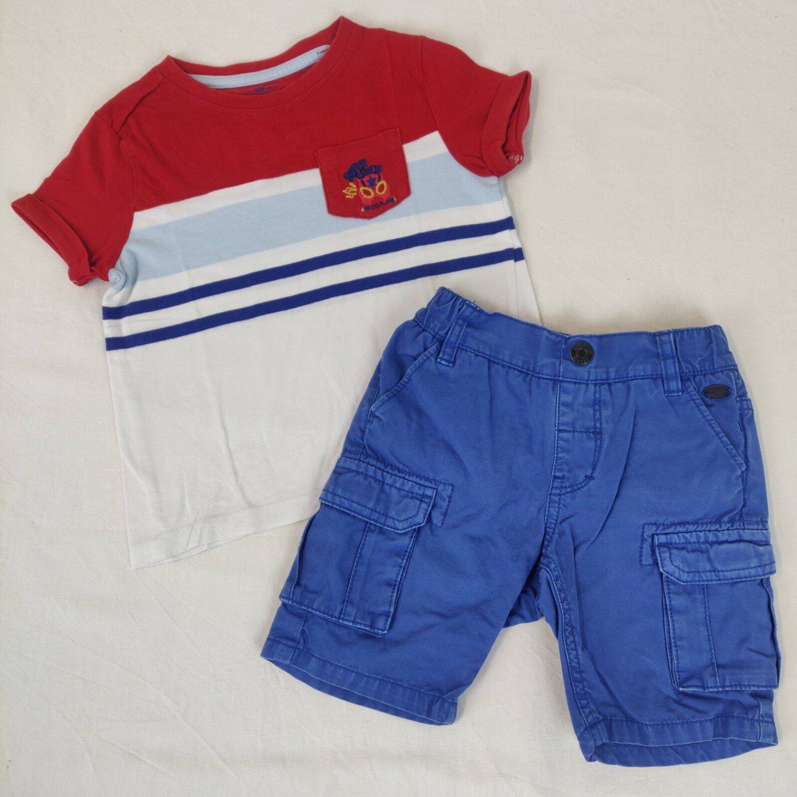 Autres commentaires : Ensemble 2 pièces. Un t-shirt à manches courtes bicolore blanc et la partie supérieure rouge. La partie blanche présente des rayures bleu clair et bleues. Une pochette centrale ornée d’un motif brodé masque de catcheur accompagné de l’inscription « super catch ». Le rebord des manches est retroussé. Un bermuda – bleu. Taille élastique. 2 poches latérales, 2 poches à rabat et 2 poches arrières à rabat. Usure normale des vêtements.